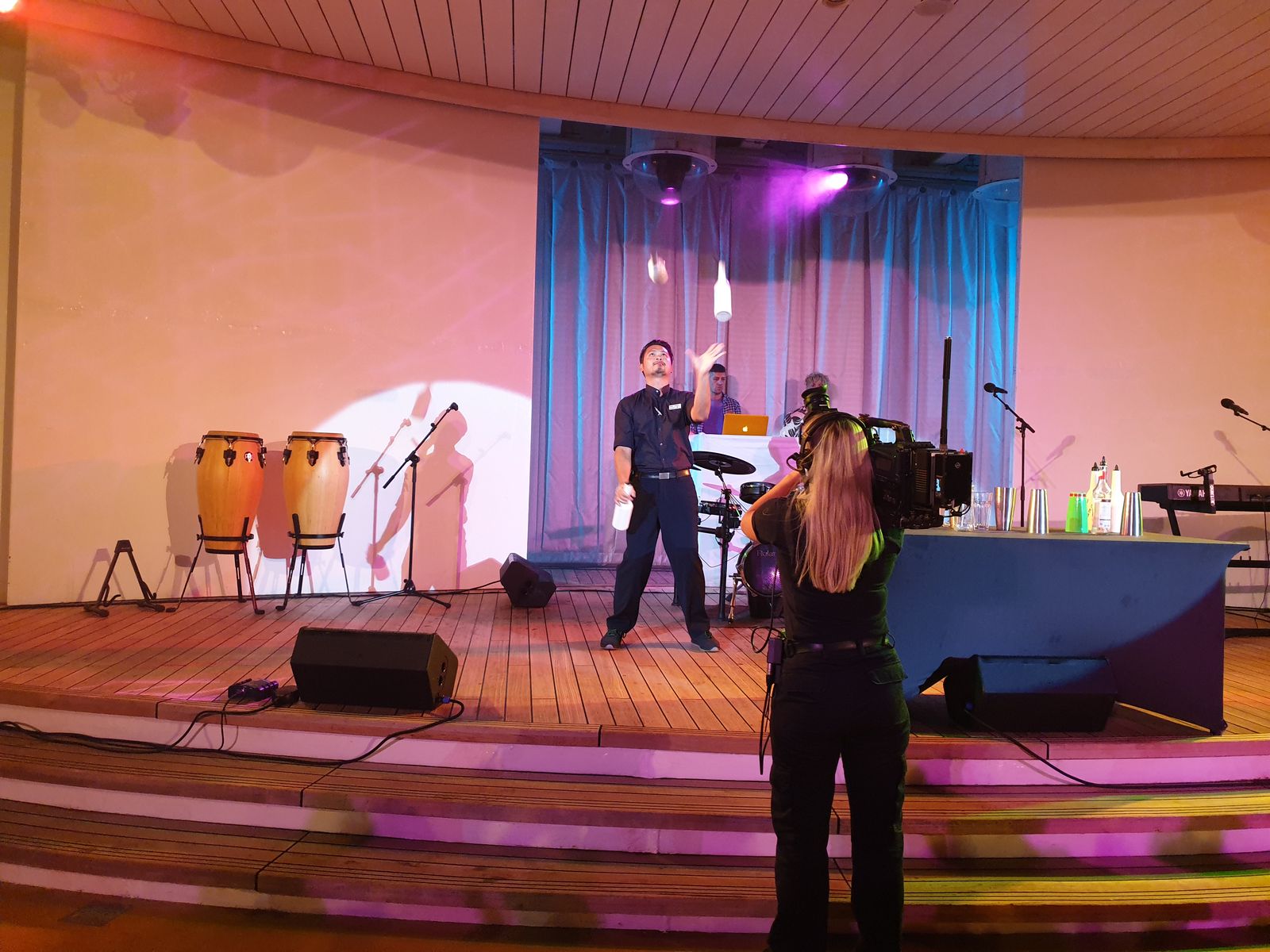 Der junge Mann gehört zur Crew und kann neben seiner normalen Tätigkeit als Jongleur ohne Panne die Flaschen fliegen lassen und wir gehen nach so viel Programm jetzt einfach an die Poolbar. Da ist es leer, denn alles Volk ist ja unten auf dem Pooldeck und tanzt. Die beiden DJ's Nathan und Nikita halten sie in Schwung, der Clubtanz hat nicht gefehlt.
