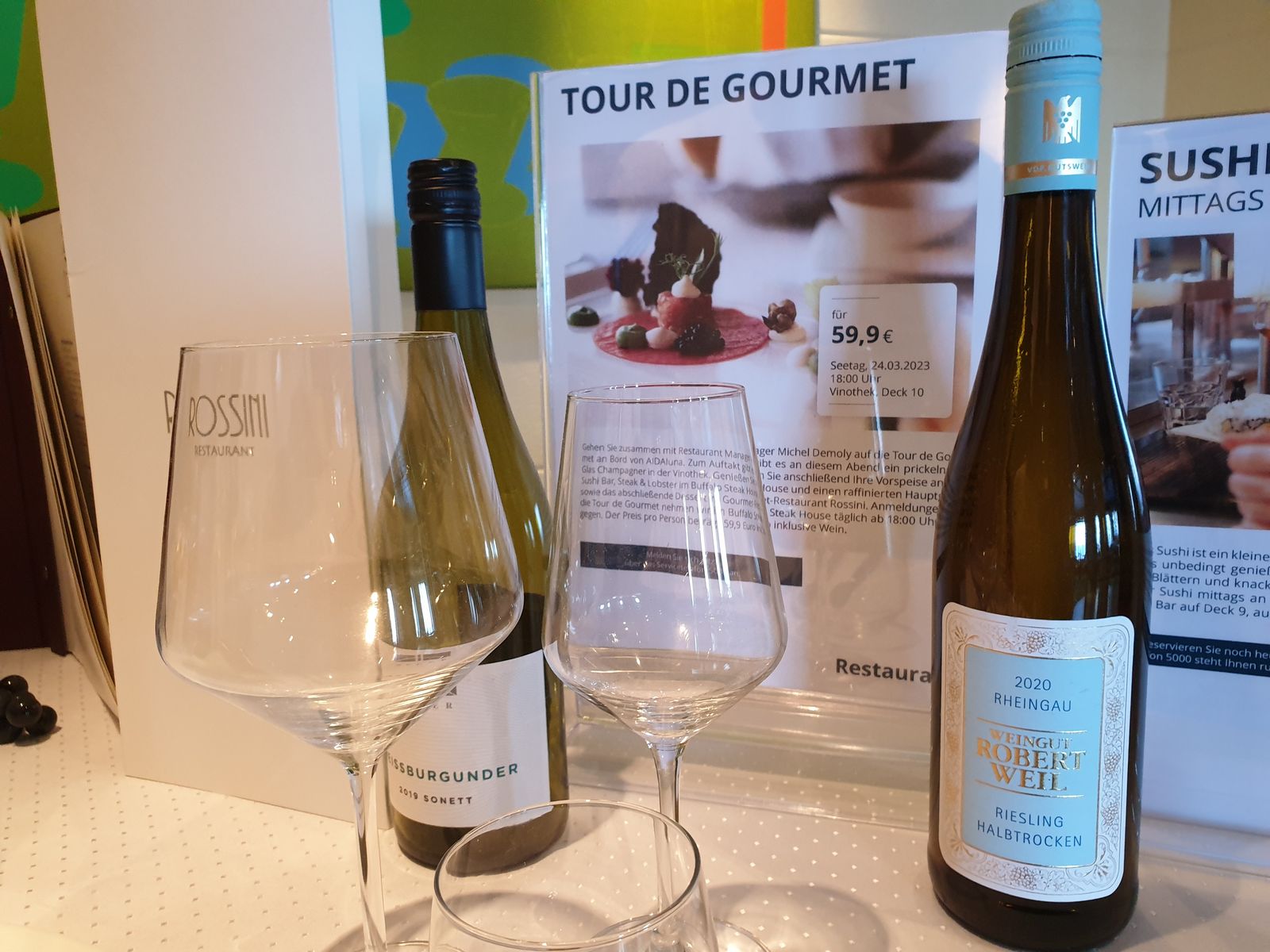 Auf dem Weg zur Kabine sehe ich einen Aufsteller, der auf ein besonderes Event hinweist „Tour de Gourmet“. Haben wir noch nie gemacht und wie ich so meinen Mann anschaue, kommt sofort „Schatz, wenn du möchtest, ich wäre mit dabei“. „Oh ja, das würde mir gefallen, mal was Neues zu erleben!“ Also werden wir uns anmelden – morgen.