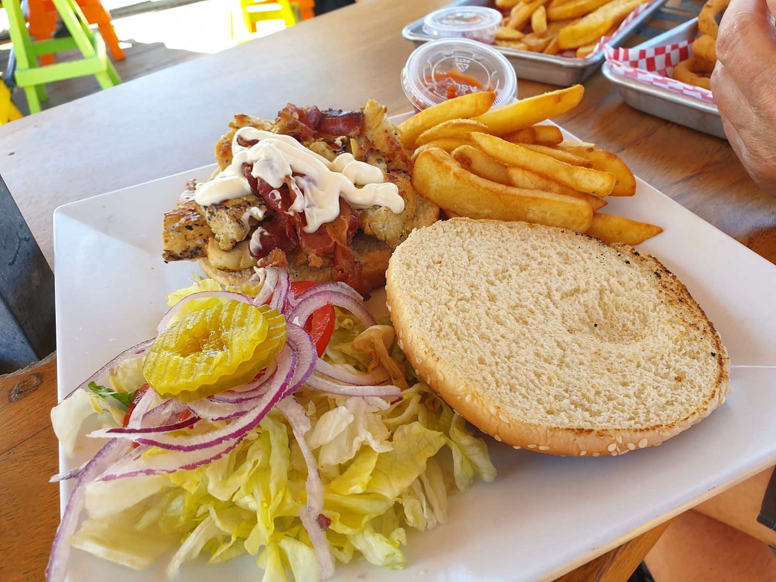 Und startet eine Maschine, wird es heiß und staubig am Zaun. Die Luft der Düsen bläst in Richtung Strand und dann höre ich die Leute schon johlen. Nein, das ersparen wir uns und beobachten das Spektakel vom Restaurant aus. „Da haben wir aber Glück, dass wir noch einen Platz ergattert haben“ sagt mein Mann und ich freue mich mit ihm. Die Speisekarte ist reichhaltig und kurze Zeit später habe ich einen gut aussehenden Chickenburger vor mit liegen. Die Pommes waren auch so richtig gut. Da wir keine Antillengulden haben, das ist die Währung im niederländischen Teil, zahlen wir mit Karte. Alles kein Problem hier.