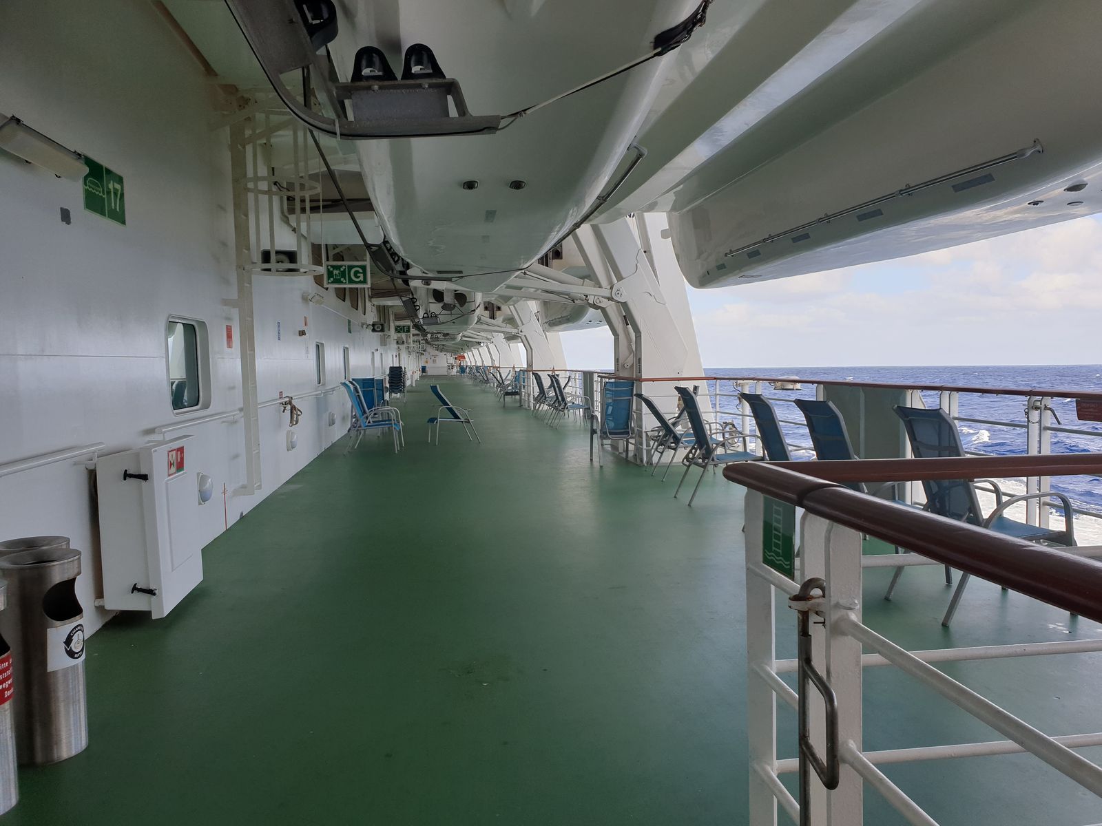 Auf Deck 5 befindet sich niemand mehr, ist ja bald Abendessenszeit. Stichwort, wir müssen uns auch noch umziehen. Die kurze Hosen meines Mannes landet im Schrank, denn die hat im Restaurant nichts suchen.