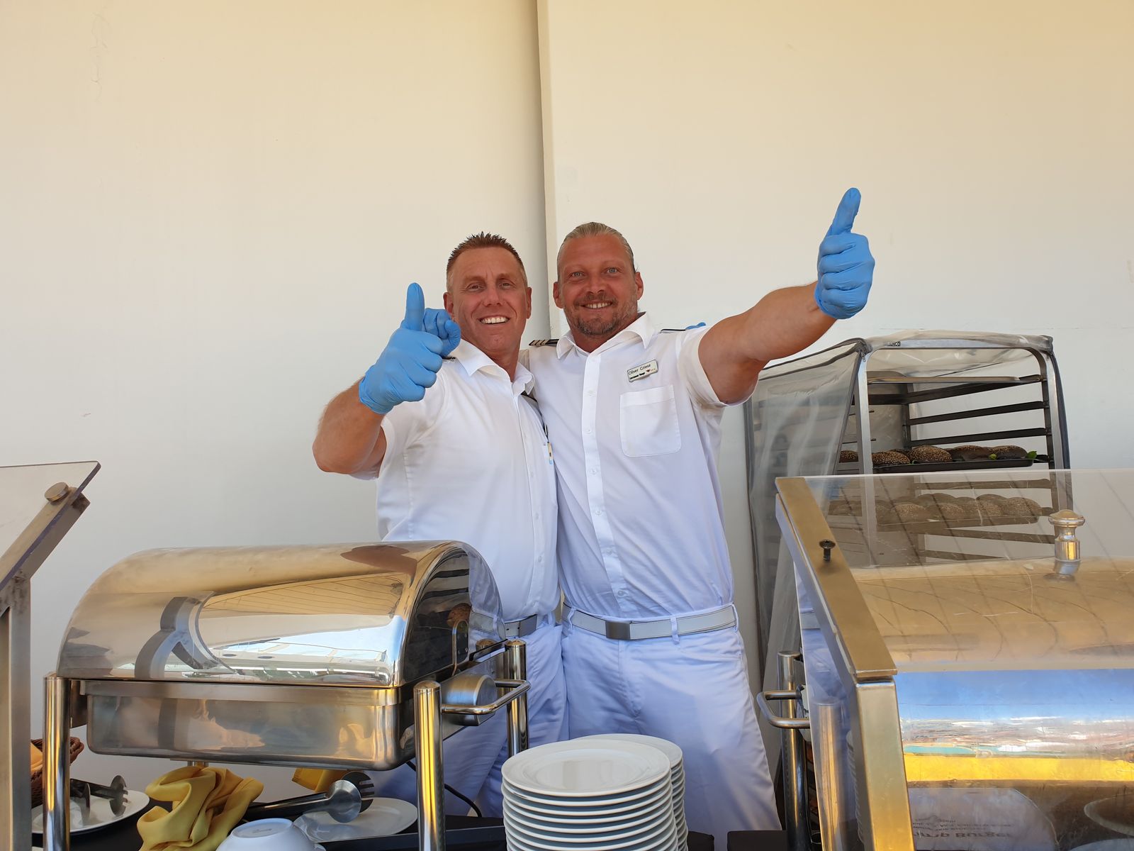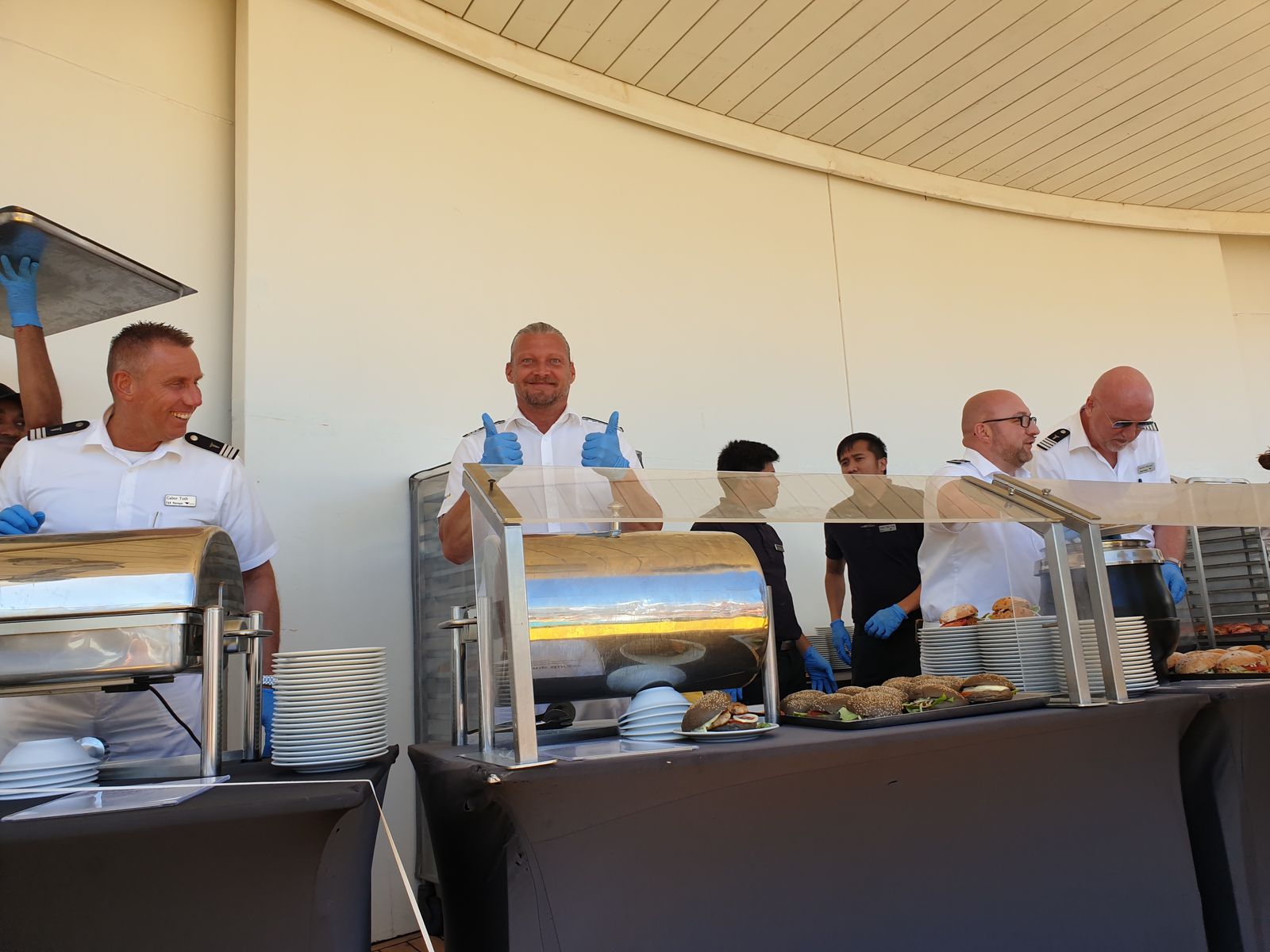 Die Offiziere sind bereit und das Büffett ist eröffnet. Ich bange etwas um die weißen Hemden und Hosen, dass sie Flecken abbekommen. Ich drücke ihnen die Daumen. Auf jeden fall schein es Gabor und Olli heute viel Spaß zu bereiten, die leckeren Gerichte unter das Volk zu bringen.