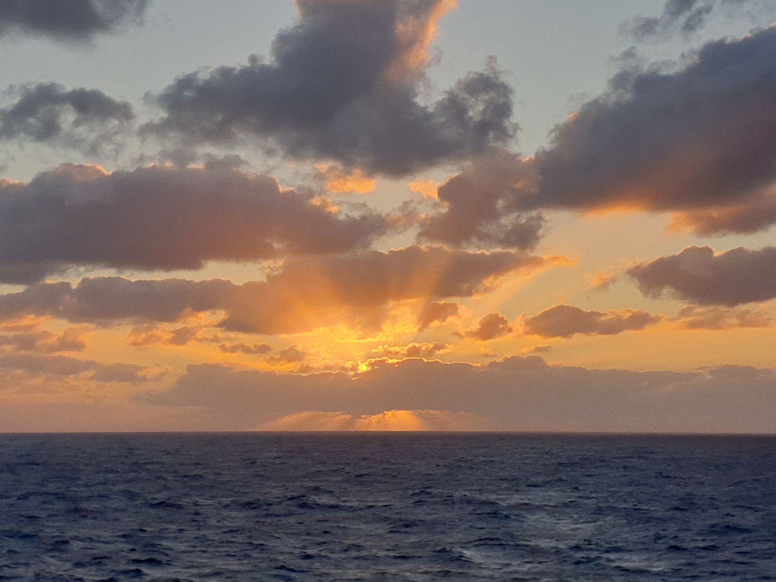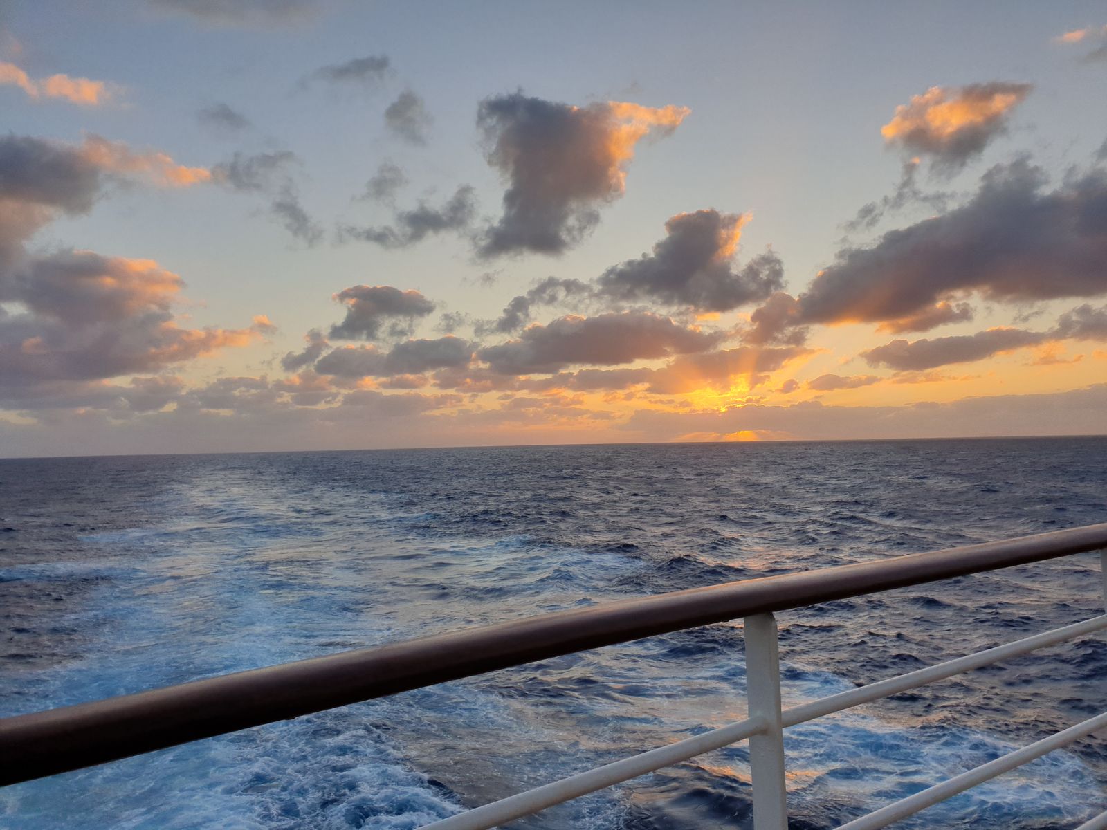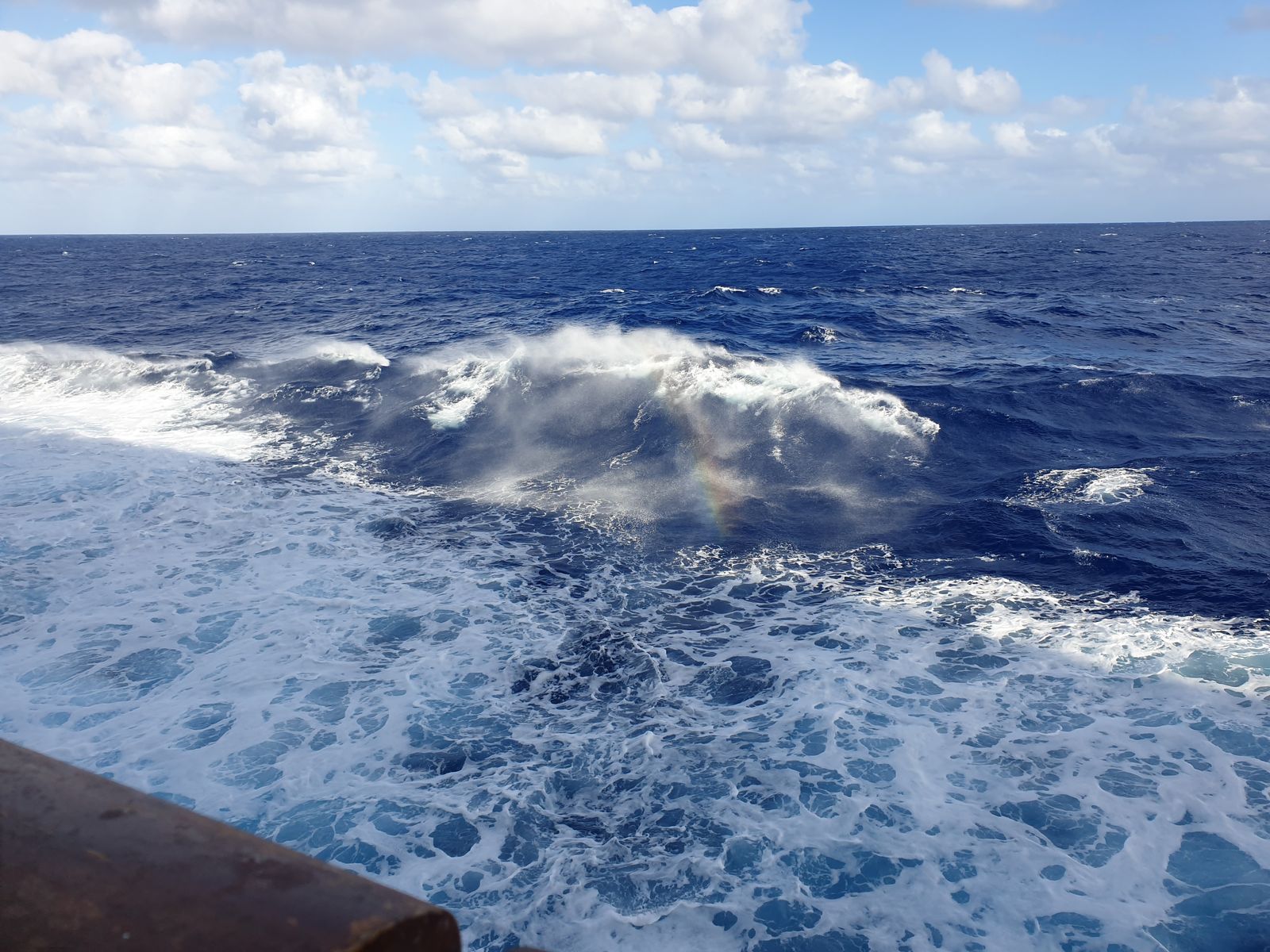 Den Rest des Nachmittags verbringen wir im Innenbereich des Schiffes. Es windet und so richtig gemütlich ist es nicht auf dem Pooldeck. „Endlich Zeit mein Buch weiter zu lesen“, murmelt mein Mann vor sich hin. Ich sortiere die Fotos auf meinem Handy, muss auch mal sein. Zwischendurch schaue ich kurz draußen nach, was sich tut und die Gischt spritzt auf und ich sehe auf dem Wasser so eine Art Regenbogen.