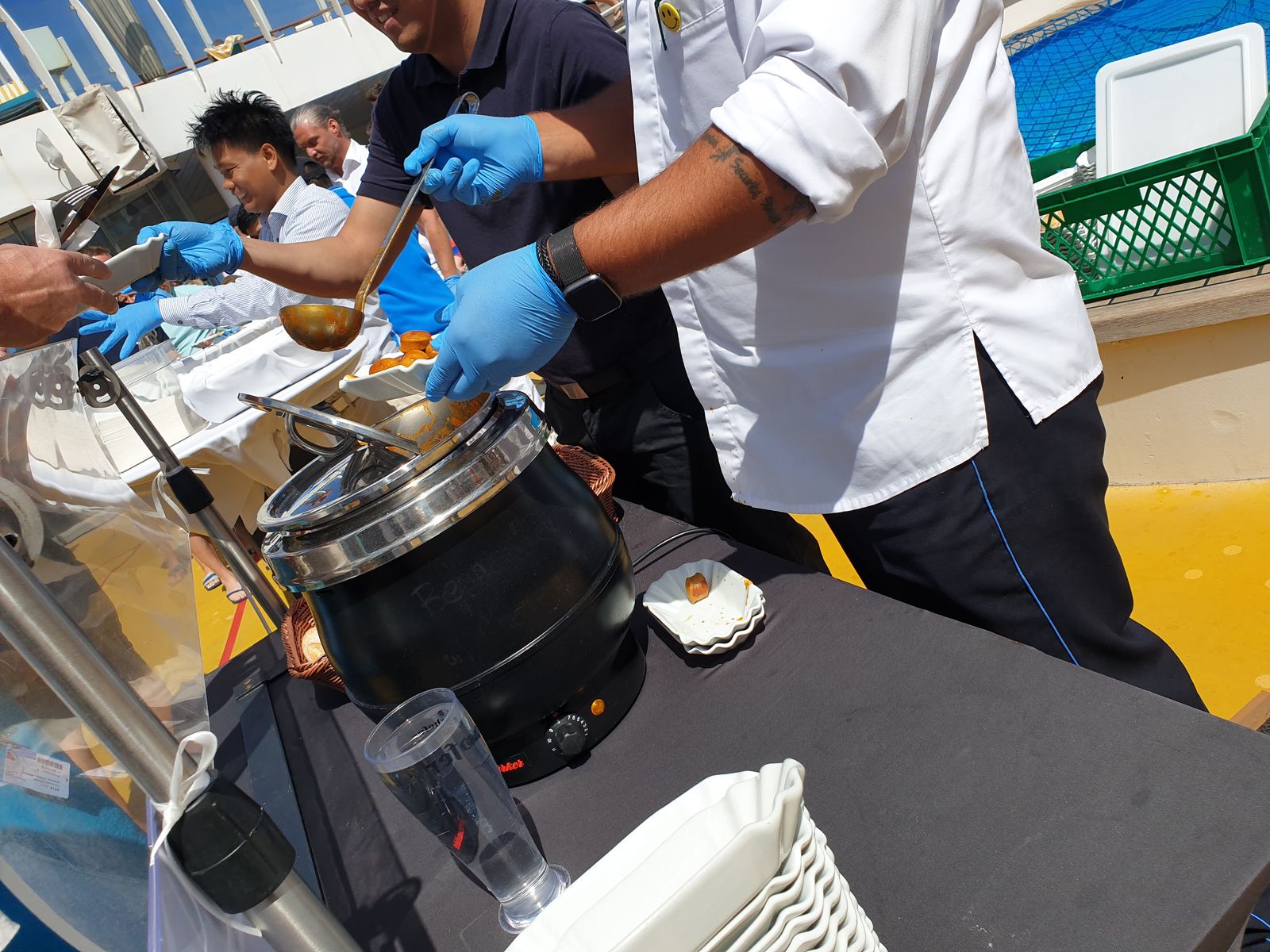 Zu dem Thema passt auch die heutige Küchen-Aktion „Scharfe-Ecke Deluxe“ auf dem Pooldeck. Himmel nein, heute konnte Kleckeralarm angesagt sein.