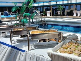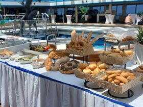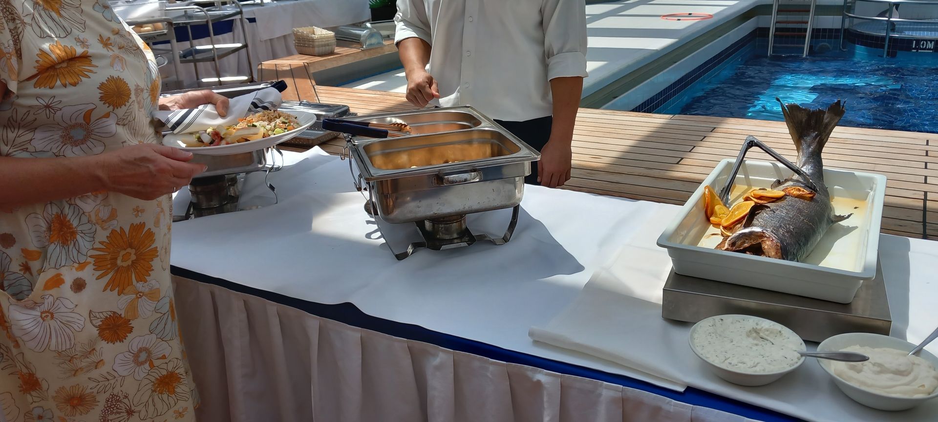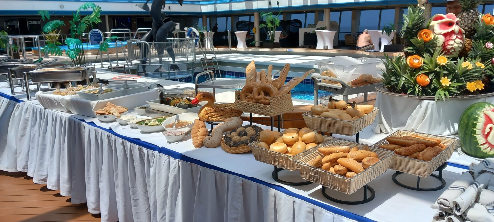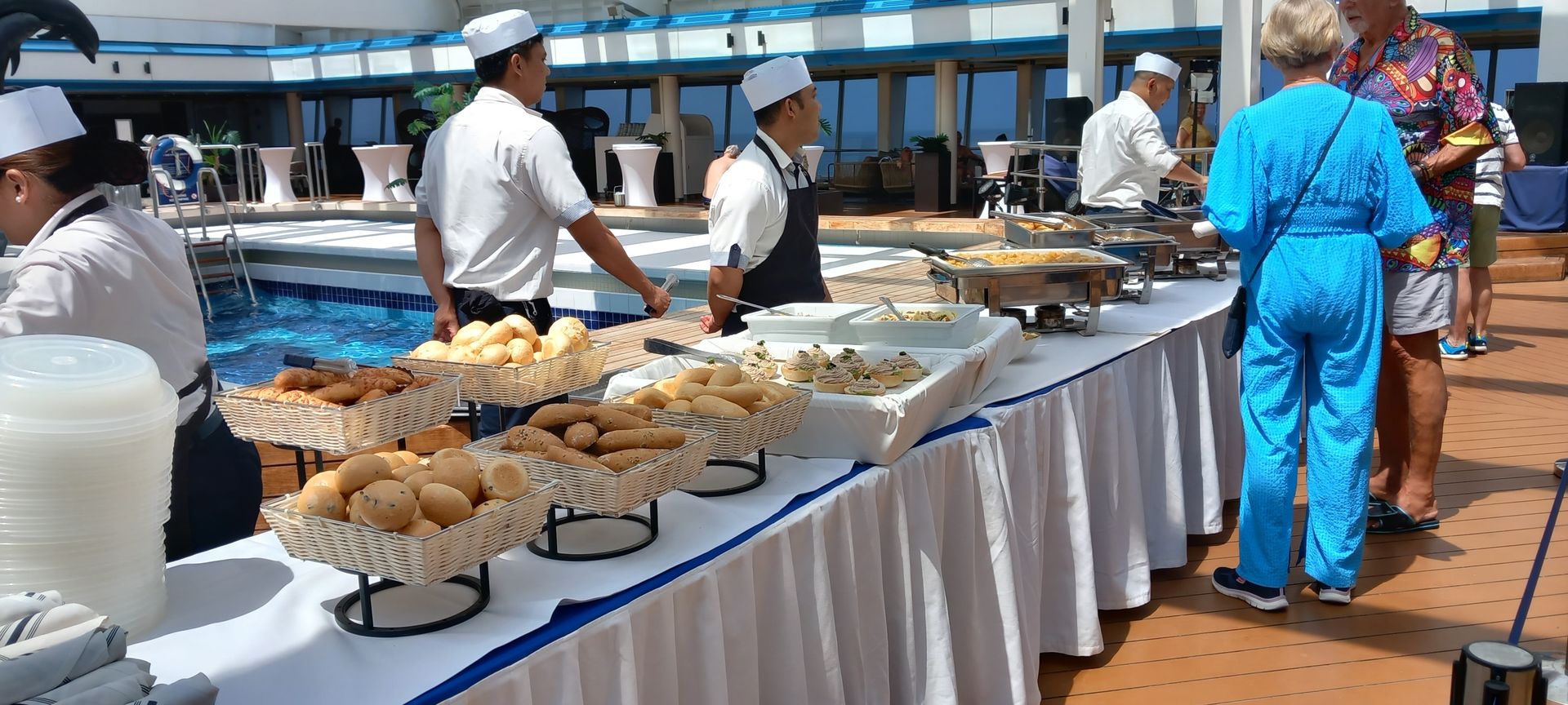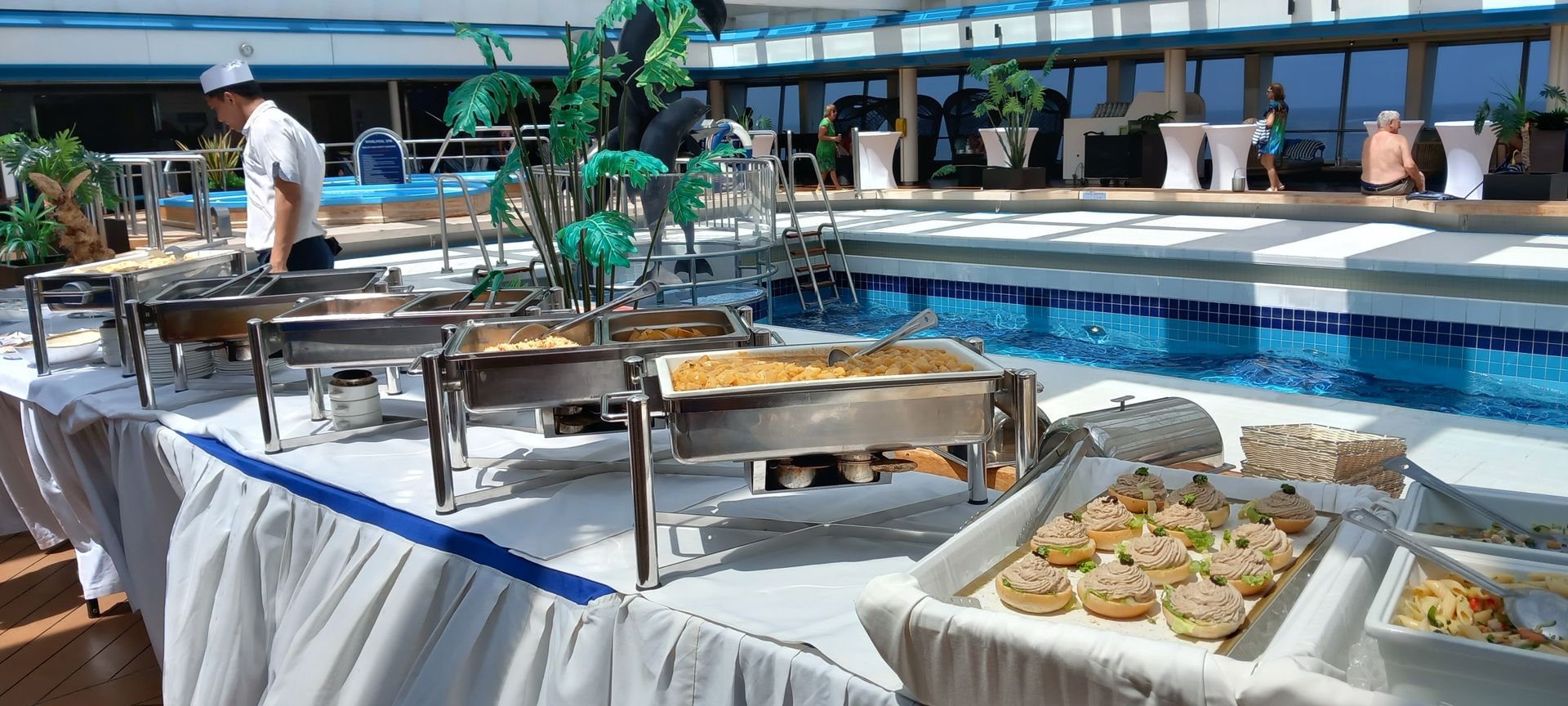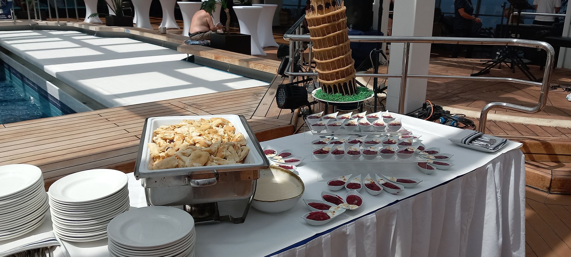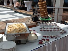 Mit Musik, Freibier, Spiele und einem Imbiss, dem Motto gerecht, vergeht die Zeit doch etwas schneller. Es wird aber weit nicht von allen Passagieren wahr genommen, daher auch hier kaum ein Anstellen am Buffet. Witzig finde ich, dass es Passagiere gibt die sich schon direkt mit Teller anstellen obwohl von dem Personal noch nicht einmal die Frischhaltefolie abgenommen wurde. Manche Gäste leiden anscheinend laufend an großen Hunger.