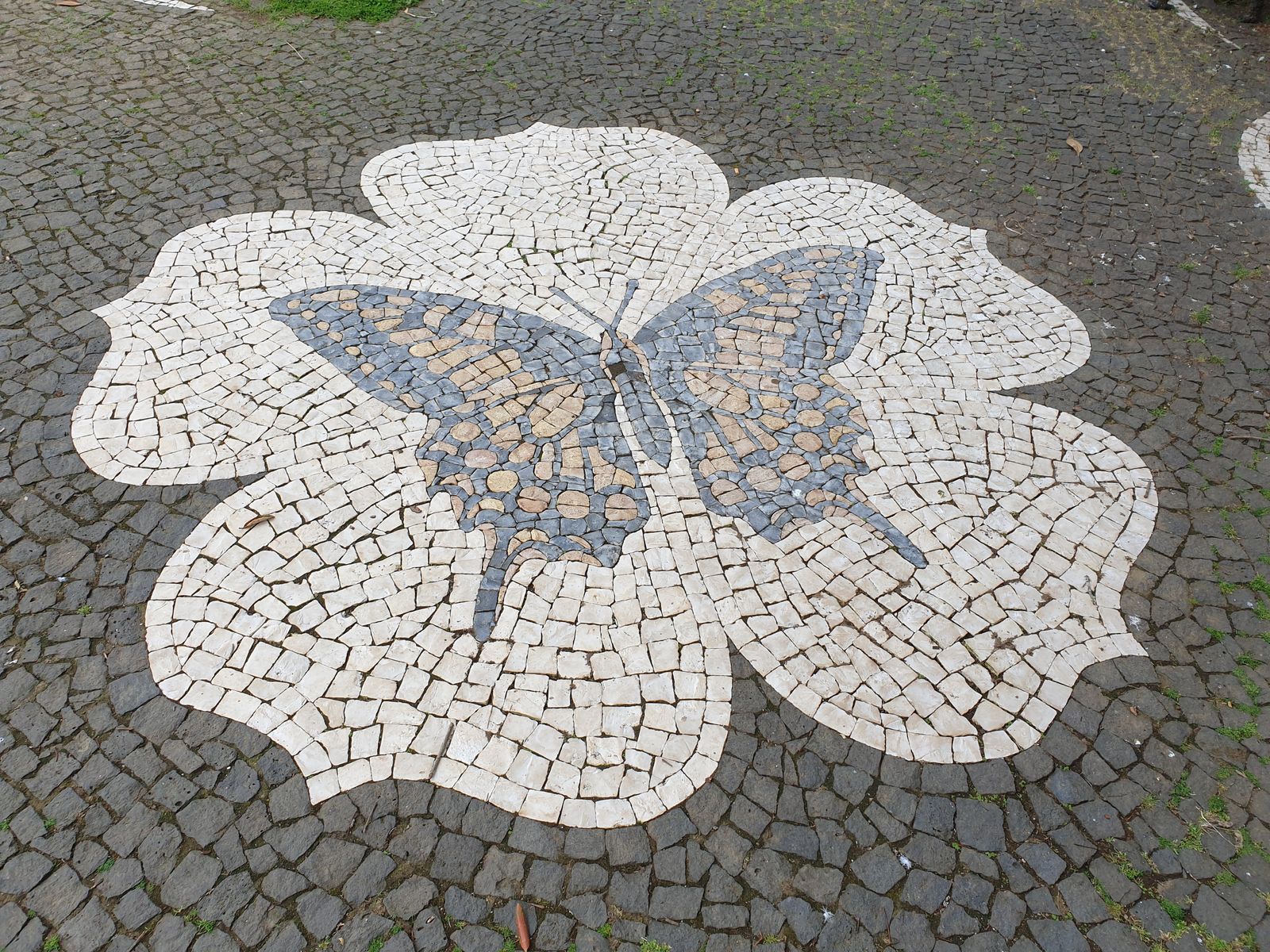 Und auch hier sind die Steine auf den Wegen zu wunderschönen Mustern verlegt. Ein Kolibri fehlt ebenso wenig wie ein Schmetterling. Ich bin hin und weg.