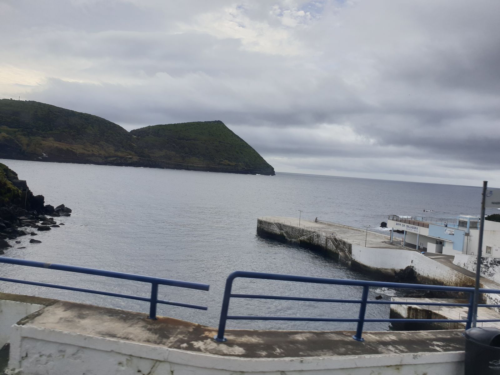 Unübersehbar ist auch die große Gesundheitseinrichtung an der wir vorbei fahren und dann erreichen wir den Badebereich Silveira, auf den wir hinunter schauen können. Es gibt Treppen, über die man ins Wasser gelangt und außerhalb der Badesaison sollen dort wohl auch Schwimmveranstaltungen stattfinden. Ich überlege gerade, wie die Wassertemperaturen sind. Durch den warmen Golfstrom liegt sie laut Tabelle im Sommer bis zu 23 Grad.