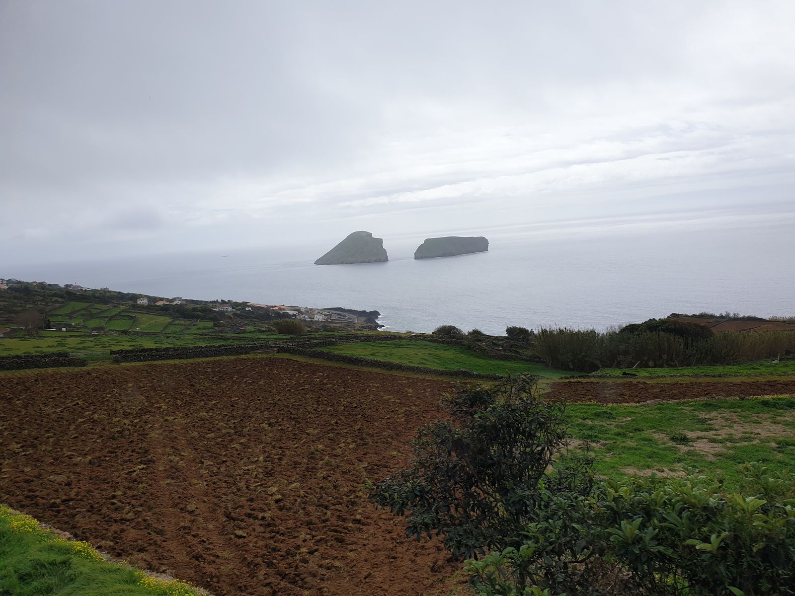 Das Bild der Insel ist geprägt von Hügeln und Senken, die vulkanischen Ursprung haben. Es gibt hier eine Bergkette, die Serra Santa Barbara heißt und reicht bis 1000 Meter hoch. An einer anderen Stelle gibt es eine Vulkansenke, die einen Durchmesser von 15 Kilometer hat. Ich schaue aus dem Busfenster und stelle fest, es hat ganz gut geregnet, denn an einigen Stellen steht auf den Wiesen das Wasser.