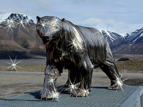 und wieder prima Ausblicke auf Flughafen, Fjord und Berge. Und auf die Speedboats, die mit unseren Mitreisenden den Isfjord unsicher machten. Nun aber zurück. An unserer AIDAluna verließen uns einige Mitfahrer, den Rest der Truppe entließ Fin im Ortszentrum. Wir spazierten über die Prachtstraße Longyearbyens. Einmal hin, einmal her. Okay, es dauerte nicht sehr lange … Das zentrale, den Minenarbeitern gewidmete Denkmal musste fotografiert werden. Vor dem Postamt gaben wir Gewehre und Pistolen ab,