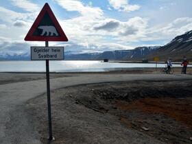 Es wurde Zeit hinabzusteigen. Von Deck 14 ins Restaurant. Frühstück. Wir ließen uns Zeit, denn die zweistündige Fahrt mit dem via Internet vorab gebuchten Maxitaxi begann erst um 10 Uhr. Und zwar pünktlich – alle waren rechtzeitig an Bord. Des Maxitaxis. Fin, unser Fahrer brachte uns zunächst – vorbei an einigen Husky-Stationen - an den Rand eines Trinkwassersees. Dorthin, wohin alle „organisierten“ Longyearbyen-Ausflügler gebracht wurden und werden. Wie AIDA-Ausflügler – einige Busse standen schon in unmittelbarer Umgebung; weitere kamen an. Wie auch ein Pulk von AIDA-Fahrradausflüglern. Warum dieser „Auflauf“? Vor dem Trinkwassersee steht das Eisbärenwarnschild, das als Foto mit nach Hause genommen werden musste.