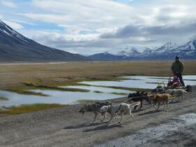 Auch wir beteiligten uns … wir machten unsere Fotos vom Schild und von der uns fesselnden Umgebung. Unmittelbar hinter der Straße begann ein Brutgebiet der Seevögel, es schloss sich der Isfjord an und weit weg, im Hintergrund, die Spitzbergengipfel und –gletscher. Unheimlich schön … Wir setzten unsere Fahrt fort. Zunächst vorbei am alten, vorsintflutlichen Flughafengebäude stoppten wir kurz, um Huskygespanne auf unsere Speicherkarten zu bannen. Sie hielten am Straßenrand neben Wasserlöchern. Die Hunde hatten Durst. Und bei ihnen ist es so wie bei den Menschen … die Getränke wurden ihnen vorgesetzt. Nicht als Cocktail in einem Glas sondern Wasser in einem Napf. Ihnen schien es zu schmecken … aber es gab auch nichts anderes …