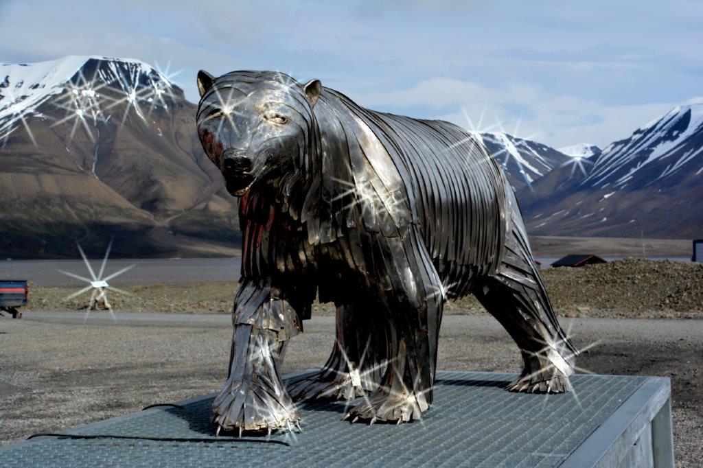 und wieder prima Ausblicke auf Flughafen, Fjord und Berge. Und auf die Speedboats, die mit unseren Mitreisenden den Isfjord unsicher machten. Nun aber zurück. An unserer AIDAluna verließen uns einige Mitfahrer, den Rest der Truppe entließ Fin im Ortszentrum. Wir spazierten über die Prachtstraße Longyearbyens. Einmal hin, einmal her. Okay, es dauerte nicht sehr lange … Das zentrale, den Minenarbeitern gewidmete Denkmal musste fotografiert werden. Vor dem Postamt gaben wir Gewehre und Pistolen ab,