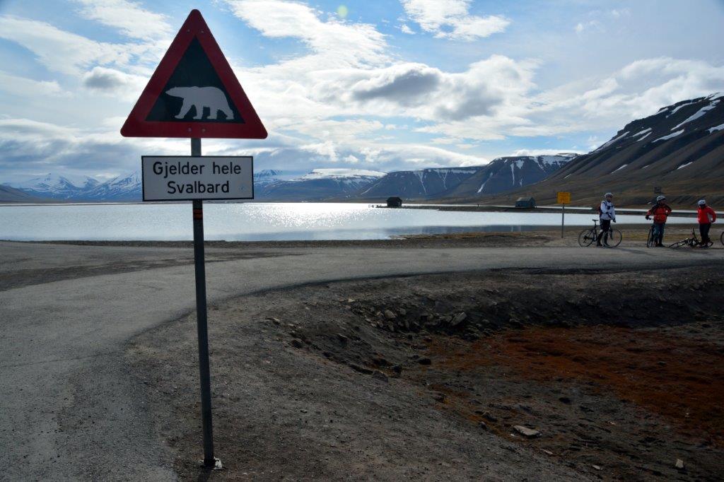 Es wurde Zeit hinabzusteigen. Von Deck 14 ins Restaurant. Frühstück. Wir ließen uns Zeit, denn die zweistündige Fahrt mit dem via Internet vorab gebuchten Maxitaxi begann erst um 10 Uhr. Und zwar pünktlich – alle waren rechtzeitig an Bord. Des Maxitaxis. Fin, unser Fahrer brachte uns zunächst – vorbei an einigen Husky-Stationen - an den Rand eines Trinkwassersees. Dorthin, wohin alle „organisierten“ Longyearbyen-Ausflügler gebracht wurden und werden. Wie AIDA-Ausflügler – einige Busse standen schon in unmittelbarer Umgebung; weitere kamen an. Wie auch ein Pulk von AIDA-Fahrradausflüglern. Warum dieser „Auflauf“? Vor dem Trinkwassersee steht das Eisbärenwarnschild, das als Foto mit nach Hause genommen werden musste.
