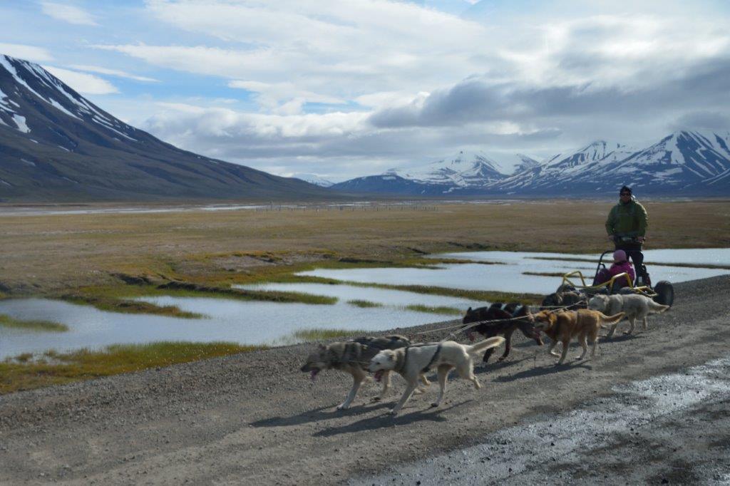 Auch wir beteiligten uns … wir machten unsere Fotos vom Schild und von der uns fesselnden Umgebung. Unmittelbar hinter der Straße begann ein Brutgebiet der Seevögel, es schloss sich der Isfjord an und weit weg, im Hintergrund, die Spitzbergengipfel und –gletscher. Unheimlich schön … Wir setzten unsere Fahrt fort. Zunächst vorbei am alten, vorsintflutlichen Flughafengebäude stoppten wir kurz, um Huskygespanne auf unsere Speicherkarten zu bannen. Sie hielten am Straßenrand neben Wasserlöchern. Die Hunde hatten Durst. Und bei ihnen ist es so wie bei den Menschen … die Getränke wurden ihnen vorgesetzt. Nicht als Cocktail in einem Glas sondern Wasser in einem Napf. Ihnen schien es zu schmecken … aber es gab auch nichts anderes …