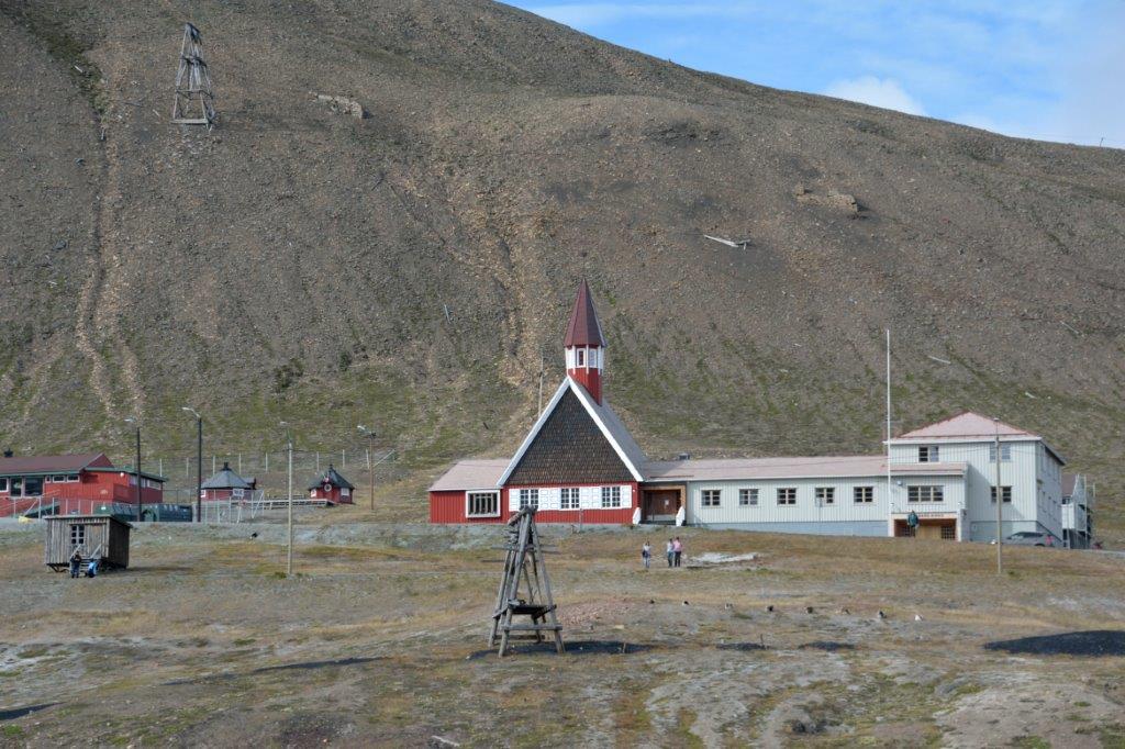 kauften Ansichtskarten und Eisbärenbriefmarken, verstauten die mit Zahlen und Buchstaben versehenen Karten im Briefkasten und vergaßen anschließend nicht, unsere Gewehre und Pistolen wieder einzusammeln. Nun trennten sich die Wege des Neunerclans. MarcoPolo und ich wollten die Svalbard-Kirke besuchen, der Rest der Truppe Longyearbyen unsicher machen. MarcoPolo und ich stiefelten hoch zur Kirche – querfeldein. Nein, nicht ganz. Ein Feld war nicht vorhanden. Eher Steine und Geröll. Na, dann hätten wir´s – doch ein Feld … das Geröllfeld! Und welch ein Wunder … in dieser unwirtlichen Einöde kämpften sich im kurzen Sommer Pflanzen und sogar Blumen hervor! Und schon wieder einer meiner Lieblingssprüche: Die Natur siegte erneut! Übrigens gab es vom Vorplatz der Kirche einen ansprechenden Blick über die Stadt.