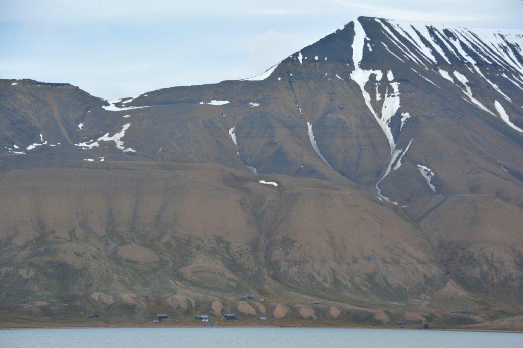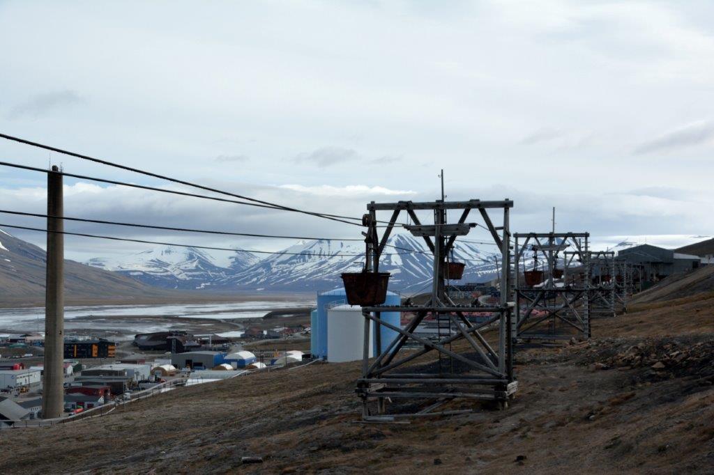 Wir hatten noch ziemlich viel Zeit bis „Alle Personen an Bord“ und beschlossen, an den Kohletransportseilen vorbei und oberhalb der Küstenstraße einen Schotterweg zu nehmen. Logisch – er ging bergauf und wir kamen ein wenig ins Schwitzen. Und das auf Spitzbergen … Doch wir wurden belohnt! Wir begegneten alte, inzwischen stillgelegte Zweckbauten, die unter Denkmalschutz stehen. Und lange Zeit der Witterung getrotzt hatten.