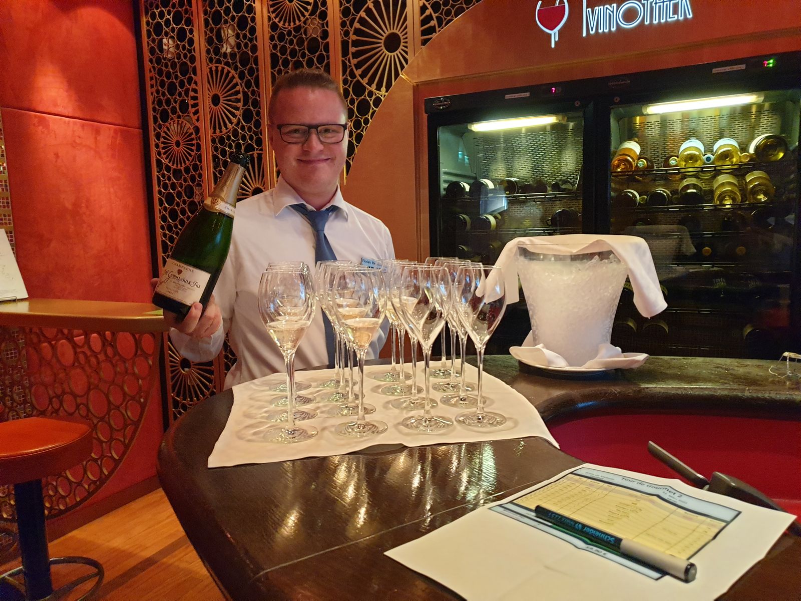 Kurz vor dem ablegen aus dem Hafen von Praia treffen wir die übrigen Teilnehmer in der Vinothek für den Auftakt der Schlemmertour. Restaurant Manager Michel Demoly wartet mit Florian auf die Gäste.