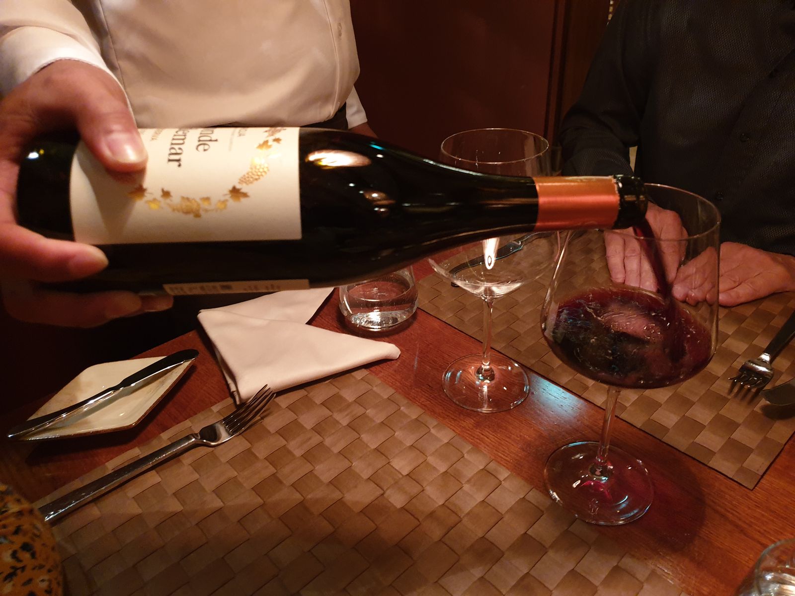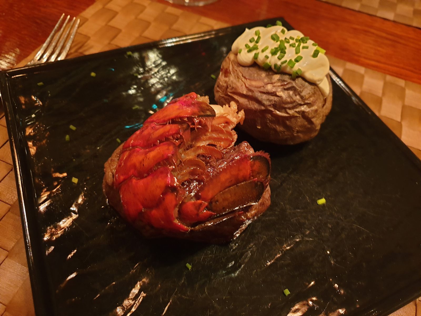 Das Filet mit dem Hummerteil oben drauf und eine Ofenkartoffel mit Sourcreme sind ist echt lecker.. Michel kredenzt einen süffigen spanischen Rotwein.