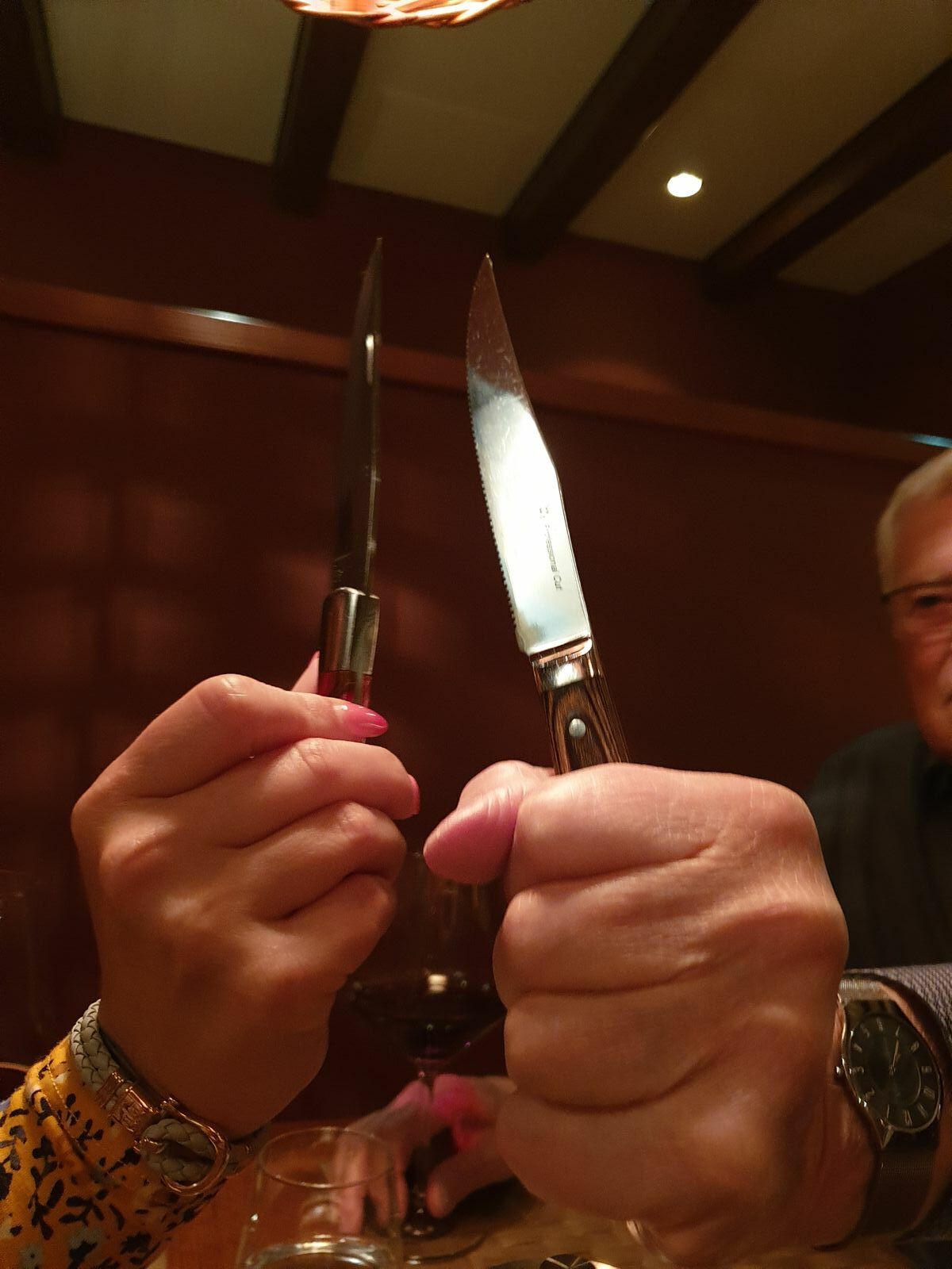 Seine Tischnachbarin ist mit dabei und es sieht aus, als würden sie sagen „Her mit dem Fleisch!“
