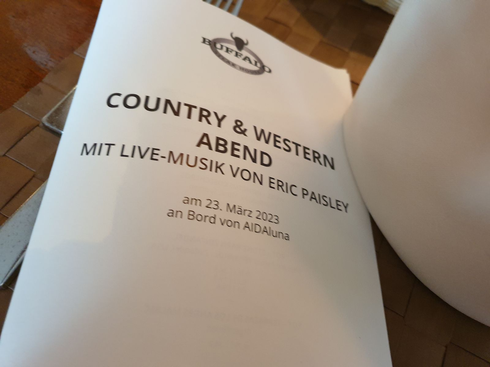 1 Seetag: Vorträge - Bewegung - Country & Western Abend mit Live Musik von Eric Paisley im Buffalo – Marc Gettmann tritt nochmal auf – Discofox Abend in der AIDA Bar mit der Band ForTune und den Offizieren