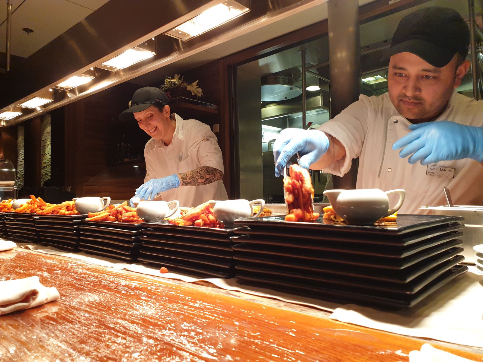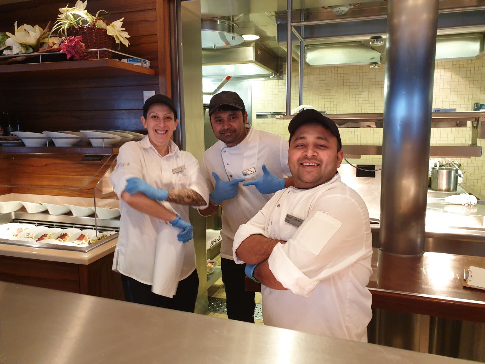 Ich möchte ein paar Fotos von der Küchencrew machen und kaum haben sie mich erblickt, strahlen sie. Ja, wir kennen uns von der Kochschule und ich werfe ihnen eine Kusshand zu.