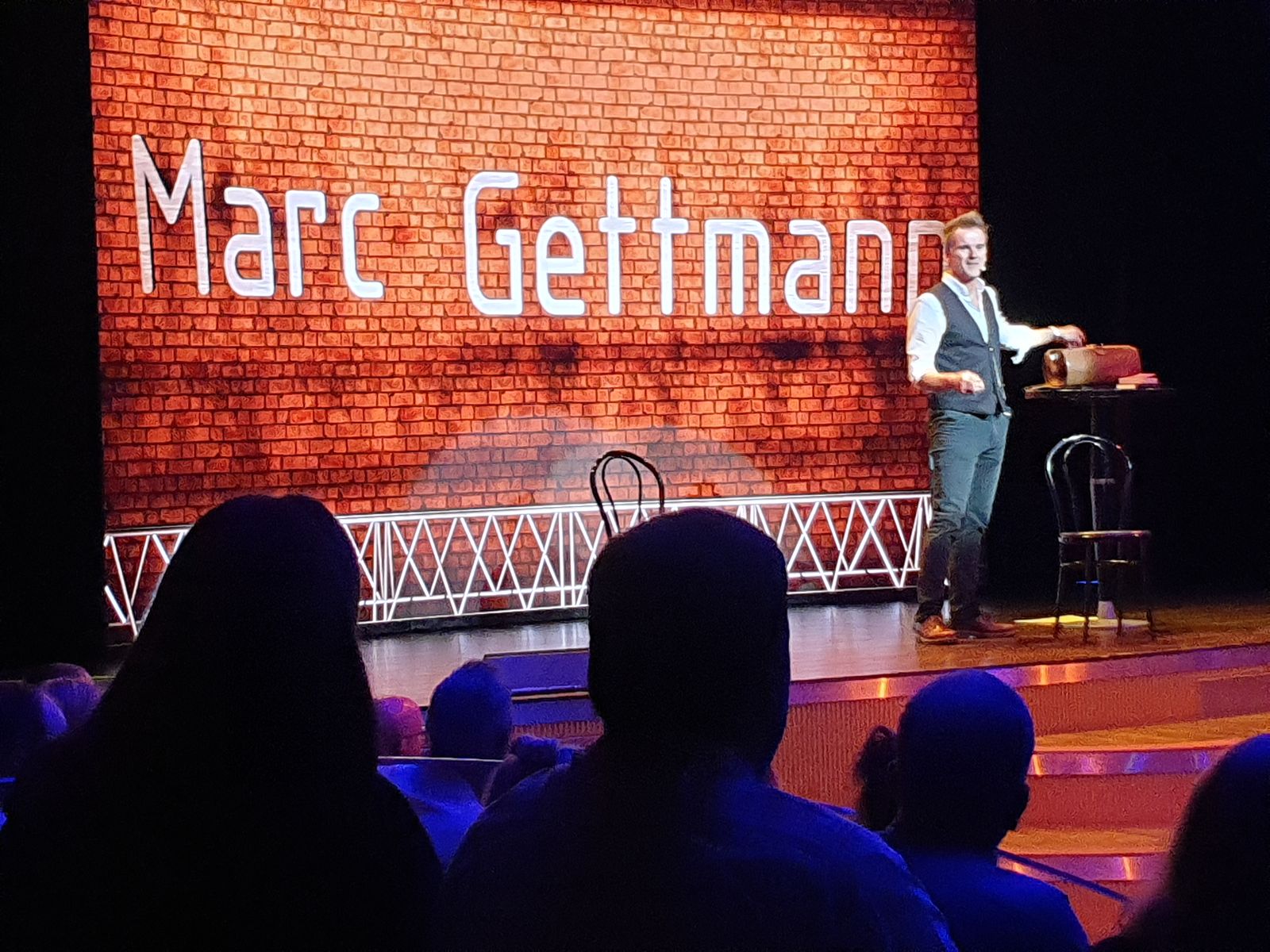 Kurz vor Ende der Show von Marc Gettman treffen wir im Theatrium ein und erleben ihn, wie er mit seinen psychologischen Kniffen und geschickter Konversation die Leute mit seinen Aktionen auf der Bühne überrascht.