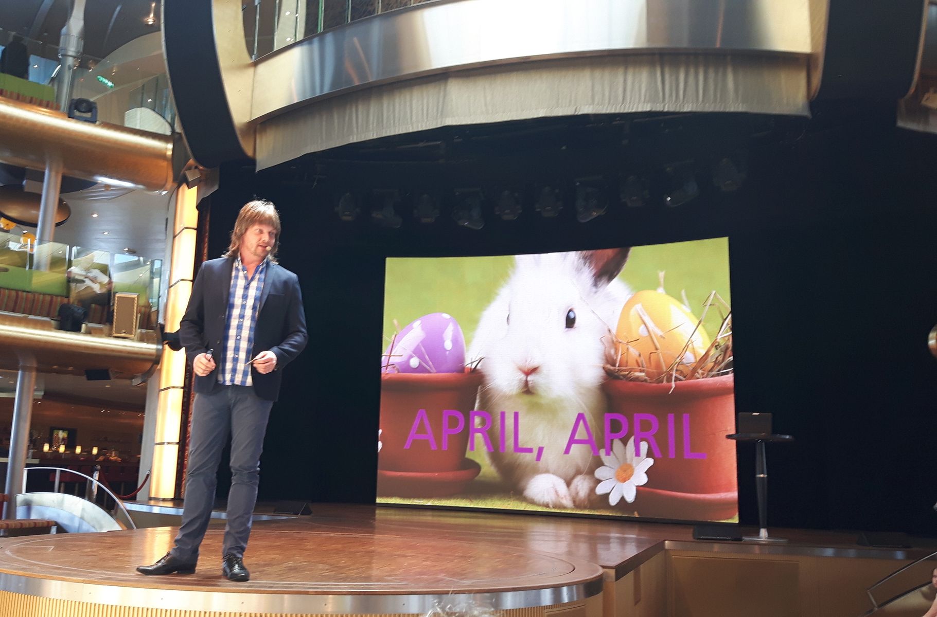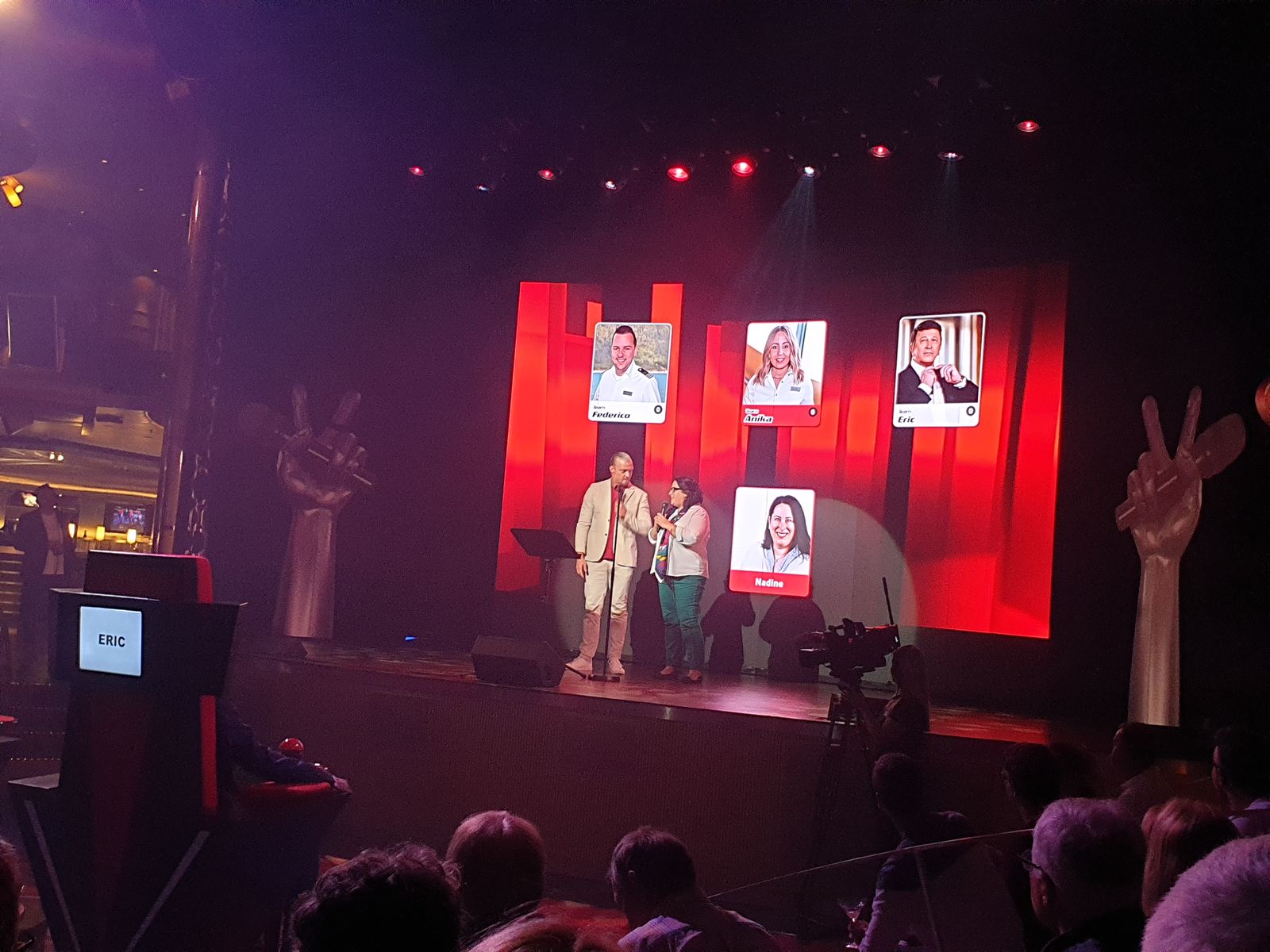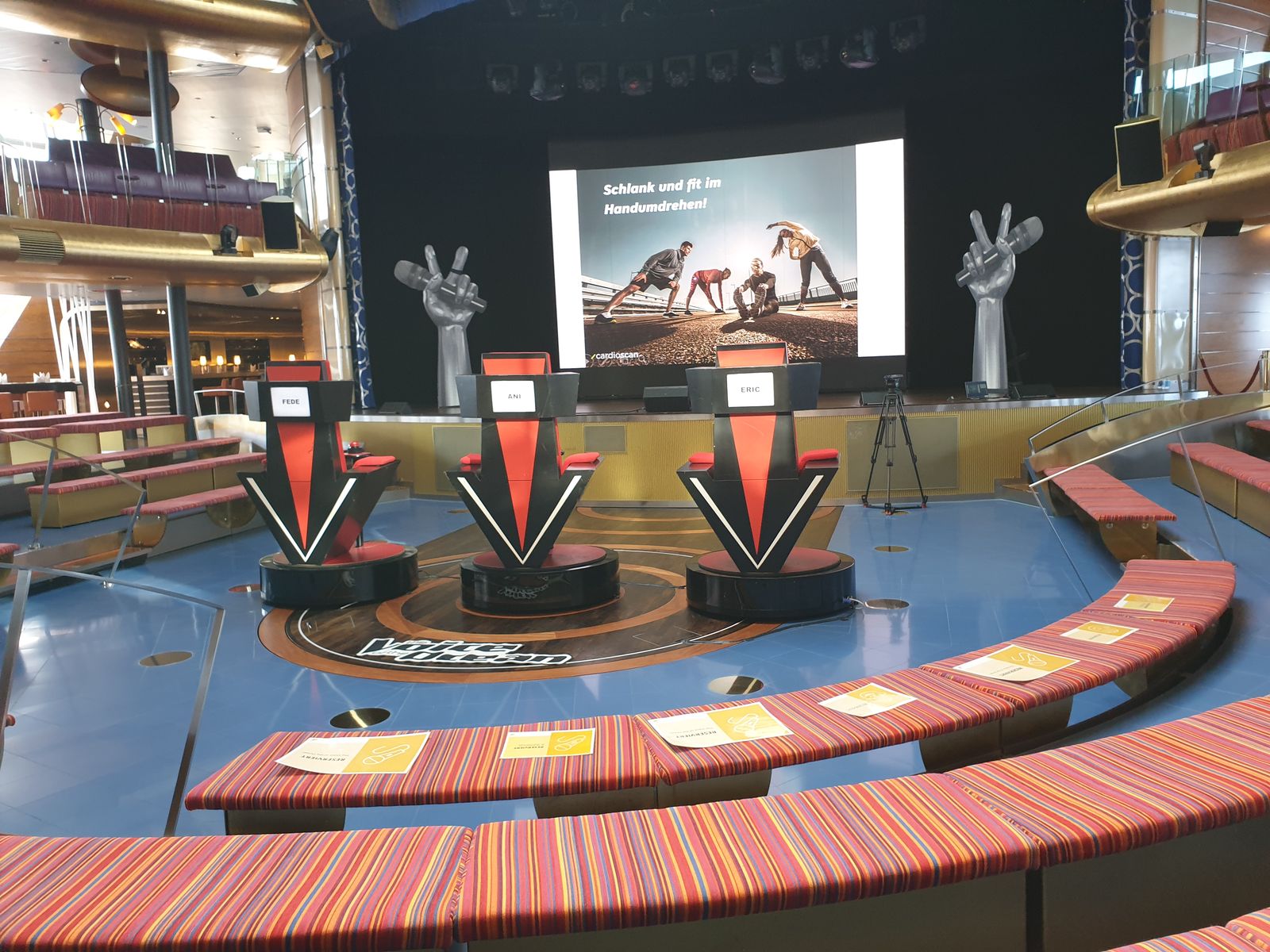 Auf dem Weg ins Weite Welt Restaurant sehen wir, im Theatrium ist alles für die Show „The Voice of the Ocean“ vorbereitet. Die Drehsessel für die Juroren sind platziert. Die gestreckten Finger mit dem Mikrofon glänzen, der Abend kann kommen. „Ich bin mal gespannt, wer dort auftreten wird und wer gewinnt“ sage ich zu meinem lieben Mann. Er grinst, „na du würdest bestimmt den Preis für die schrägste Stimme“ erhalten. Das ist ein ständiges Thema, wenn es um das singen geht. Ich finde ich KANN singen, klar treffe ich nicht immer den Ton – aber so schlimm ist es nun auch wieder nicht. „Du kannst ja mal auftreten im Brauhaus beim Karaoke. Du kannst ja singen, schließlich warst du mal in einem französischen Chor“ frotzle ich zurück. Ne, das will er dann doch nicht. Leute, solche Gespräche sind doch ganz normal oder?