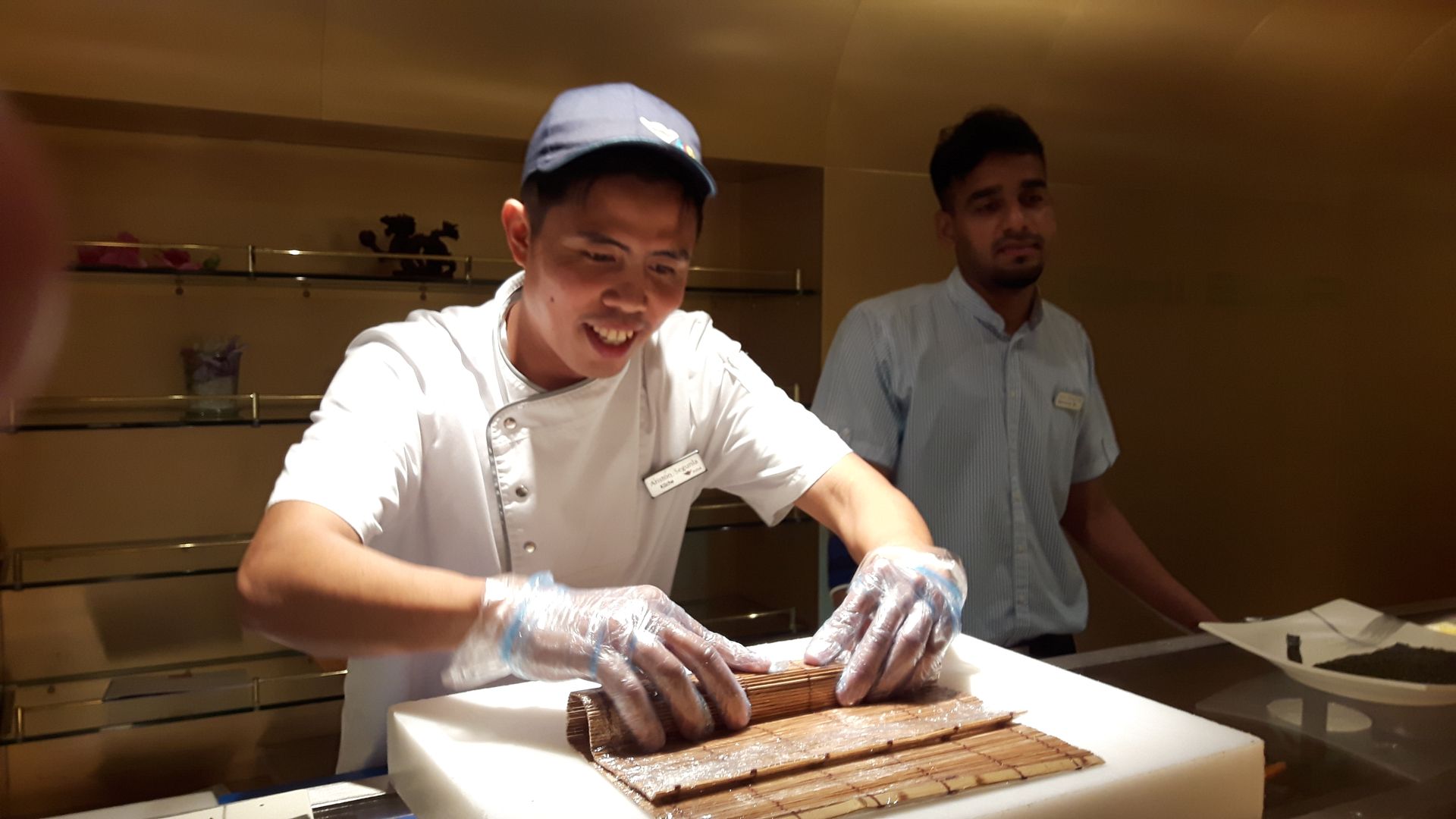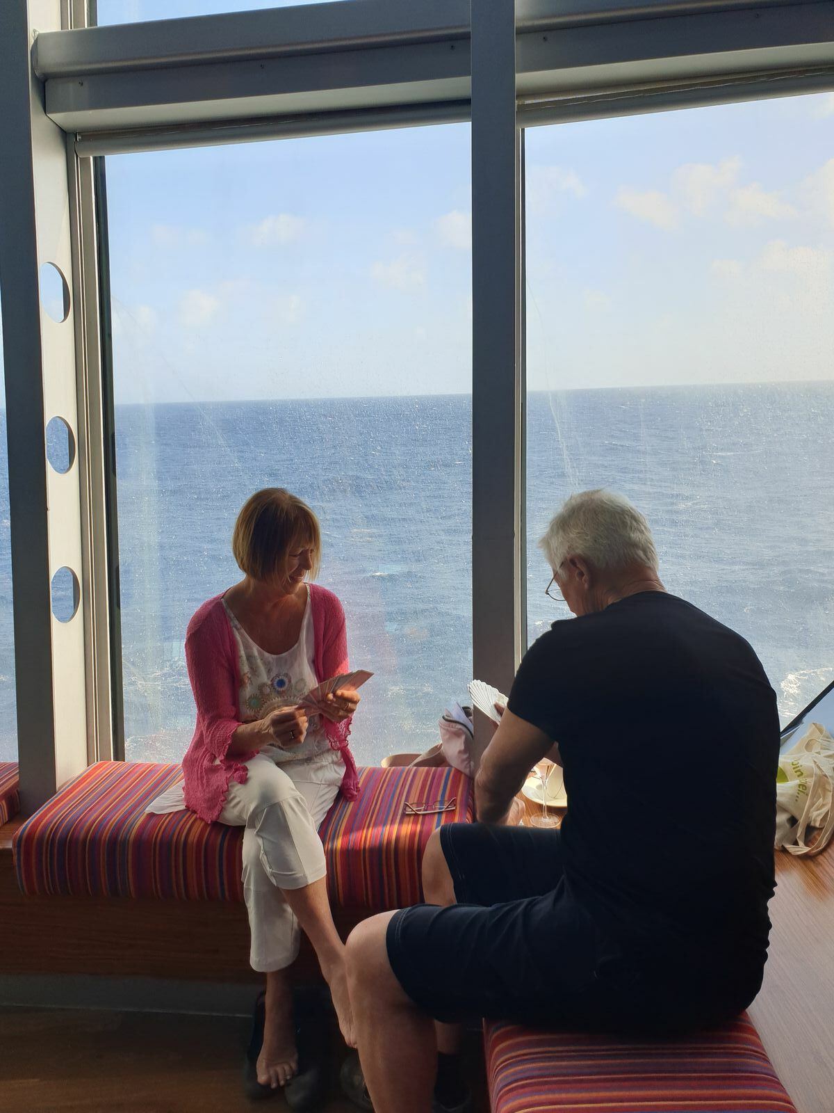 Weil wir gemütlich kuschelig sitzen wollen, suchen wir uns im Innenbereich ein Plätzchen und kramen die Karten vor. Dabei schaue ich ab und an auf die lebhaften Wellen, die Schaum produzieren, aber sich noch anständig verhalten. Dann gibt es noch ein Wiedersehen … Michel hatte mir erzählt, es gäbe an Bord noch eine Frau mit dem gleichen Vornamen. Na ja, er ist schon sehr selten in Deutschland – es ist ein alter ungarischer Vorname und dann steht die andere Etelka vor mir. Wir lachen uns an, denn wir sind uns schon mal begegnet und zwar am 29.3.2018 auf der Bella während der Reise von Dubai nach Mallorca – Ort: Sushi-Workshop. Witzig ist, dass der Mitarbeiter, der den Workshop leitete jetzt auch an Bord ist. Sachen gibt es …. und Olli war auch bei der Reise dabei und nicht zum ersten mal. 2011 war er auf der Luna bei der Westeuropa-Tour dabei und im gleichen Jahr im November auf der Blu, als ich mit meiner Mutti im Roten Meer herum geschippert bin. Man trifft sich irgendwo wieder, dass ist AIDA. Übrigens, den Kapitän auf dieser Reise, hatten wir auch im Jahr 2015 an Bord, bei der Tour Cochin-Antalya. Es gibt viele Mitarbeiter in den verschiedenen Bereichen, die über viele Jahre schon fast zum AIDA-Inventar gehören. Also salopp ausgedrückt.
