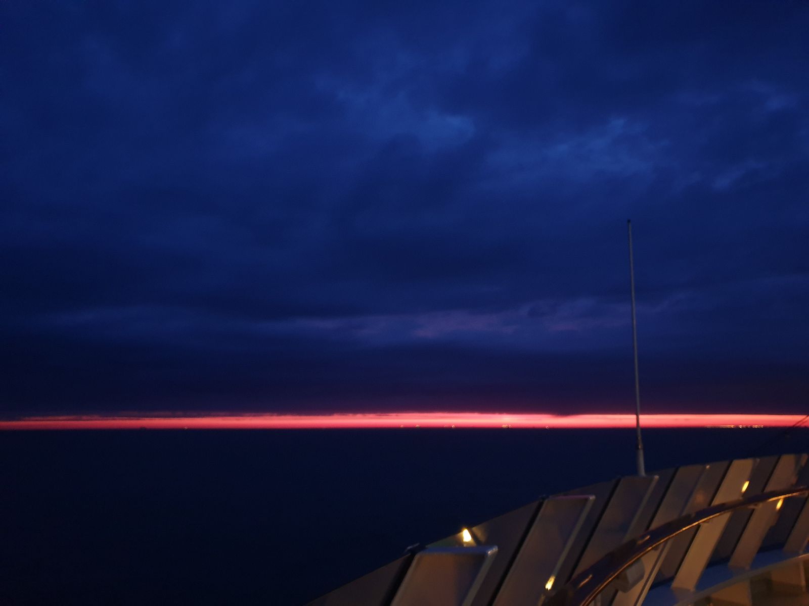 So, ich habe den Wecker gehört und bin hoch gestiegen, um die weißen Klippen zu sehen. Es ist aber noch ganz schön dunkel und die Sonne am Horizont ist um 6.35 nicht zu sehen, lediglich ein schmaler roter Streifen. Gut eine Stunde später taucht sie auf und lässt das Meer rosa leuchten.