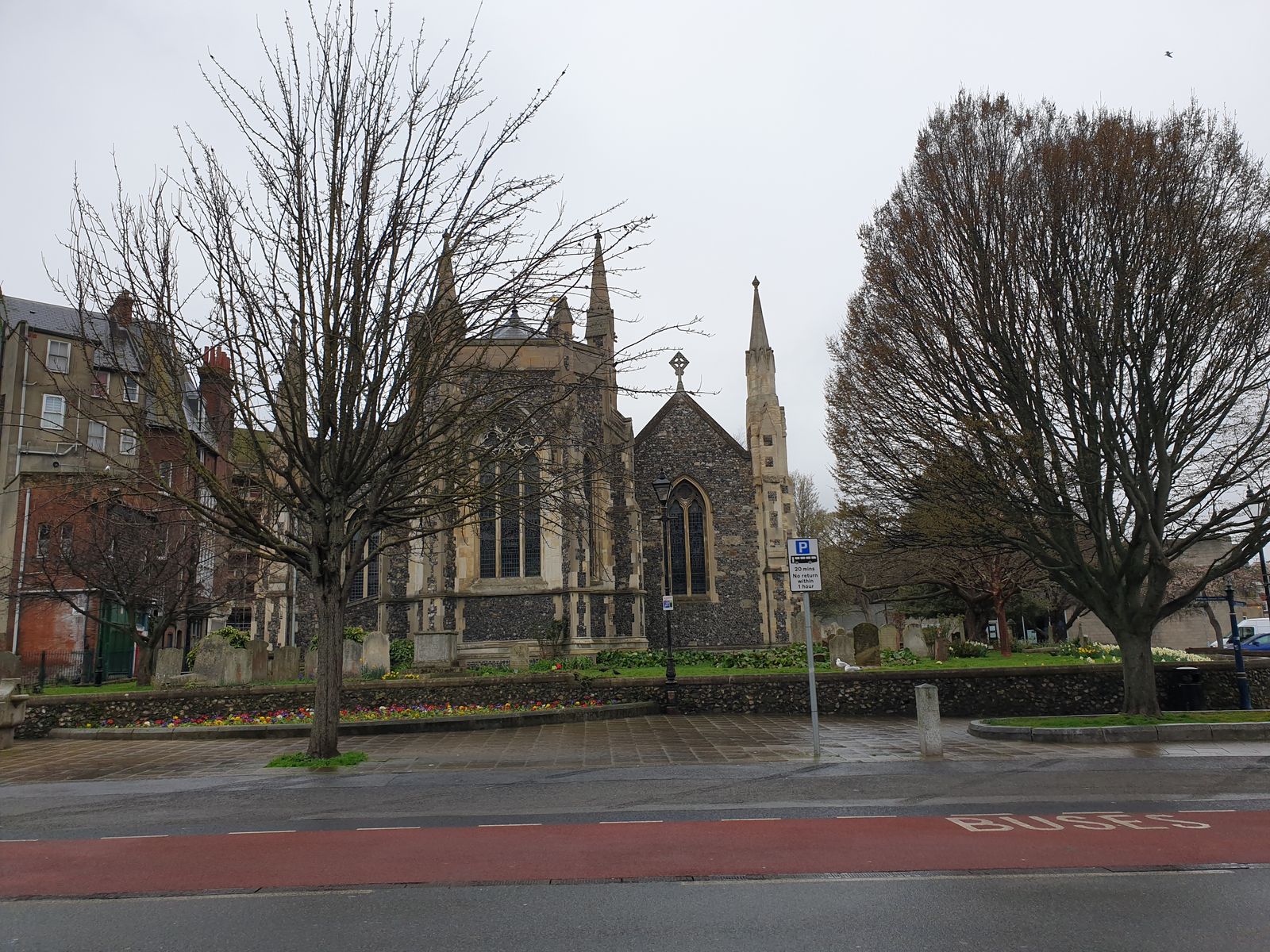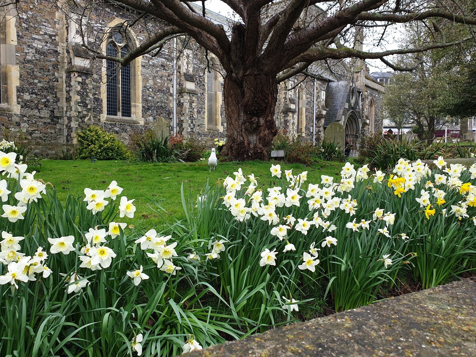 Rings um die St. Mary's Church blühen Narzissen und majestätisch marschiert eine weiße Möwe durch das Gras. Lange stehen bleiben können wir nicht, denn es regnet so vor sich hin.