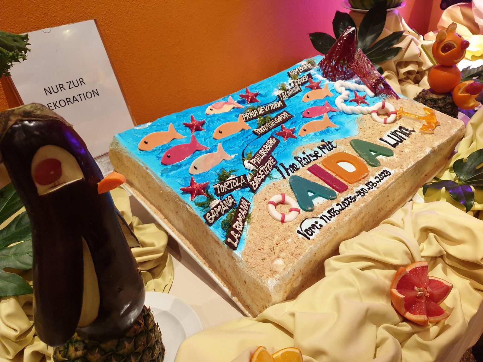 Schnell springe ich noch mal zum Eingang, denn dort sind die große Torte sowie die Obst- und Gemüseschnitzereien zu bewundern. Die bunten Farben der Tortendekoration passen irgendwie gut zur Karibik. Wie ich wieder Platz nehme im Restaurant, fühle ich mich ständig beobachtet. Möwen sitzen draußen auf den Tischen und schauen gierig in unsere Richtung.