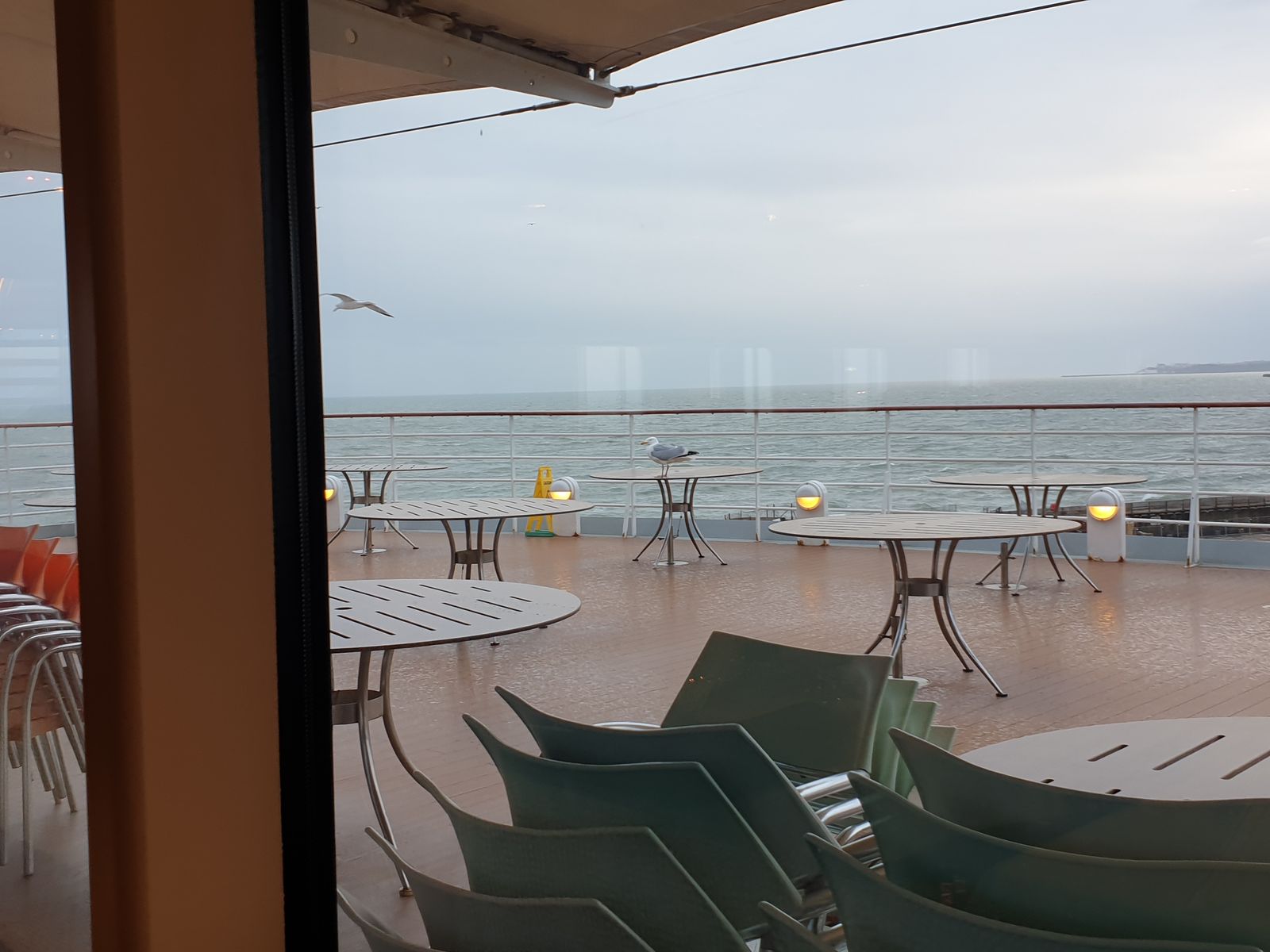 Wir entscheiden uns für Indonesien und finden noch freie Plätze in der Nähe der großen Fenster. So können wir speisen und auch noch das Ablegen von Dover zu verfolgen. Gute Kombination, finde ich.