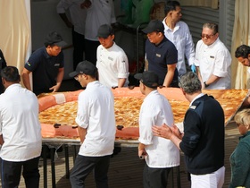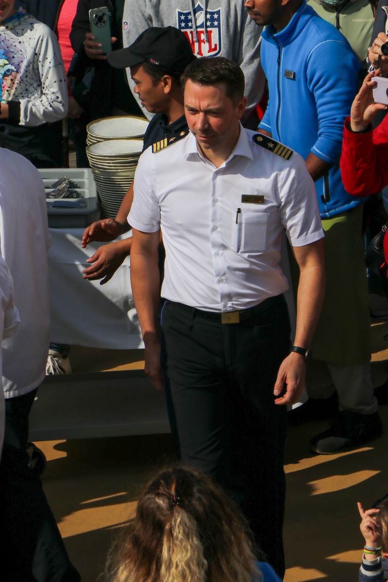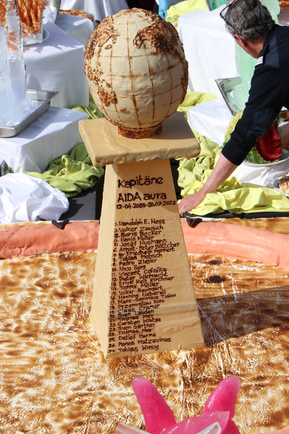 Es wurden Bereiche aufgebaut wie Body & Soul Spa, Spiel & Spaß, Foto mit dem Eisbär, drehen am Glücksrad von AIDA Shoppingwelt, Brücken- und Ingenieurcrew uvm. Die AIDAstars sind aufgetreten. Dazu tanzte das Housekeeping-Team. Dann kam noch das Highlight: Ein wirklich riesiger Biskuit-Kuchen als Rettungsring mit einer Weltkugel in der Mitte, wo alle Kapitäne aufgelistet waren, die als Kapitän auf der AIDAaura gefahren sind, Natürlich war die Torte nicht nur optisch ein Genuss!