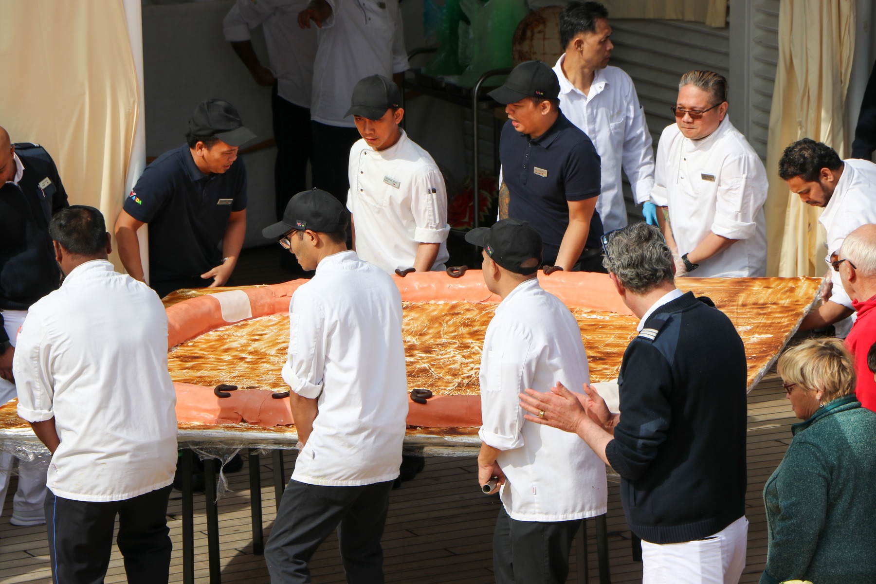 Es wurden Bereiche aufgebaut wie Body & Soul Spa, Spiel & Spaß, Foto mit dem Eisbär, drehen am Glücksrad von AIDA Shoppingwelt, Brücken- und Ingenieurcrew uvm. Die AIDAstars sind aufgetreten. Dazu tanzte das Housekeeping-Team. Dann kam noch das Highlight: Ein wirklich riesiger Biskuit-Kuchen als Rettungsring mit einer Weltkugel in der Mitte, wo alle Kapitäne aufgelistet waren, die als Kapitän auf der AIDAaura gefahren sind, Natürlich war die Torte nicht nur optisch ein Genuss!