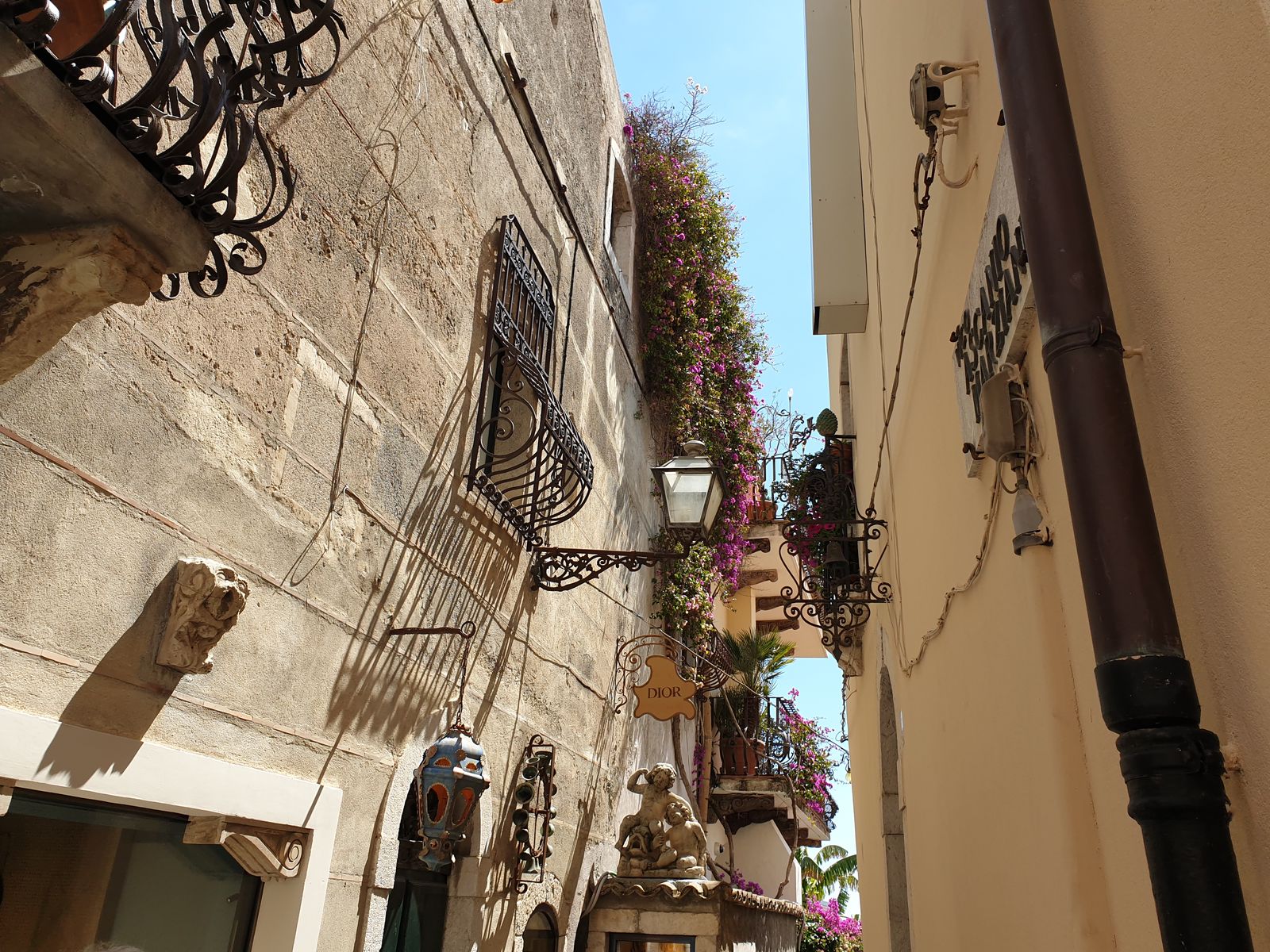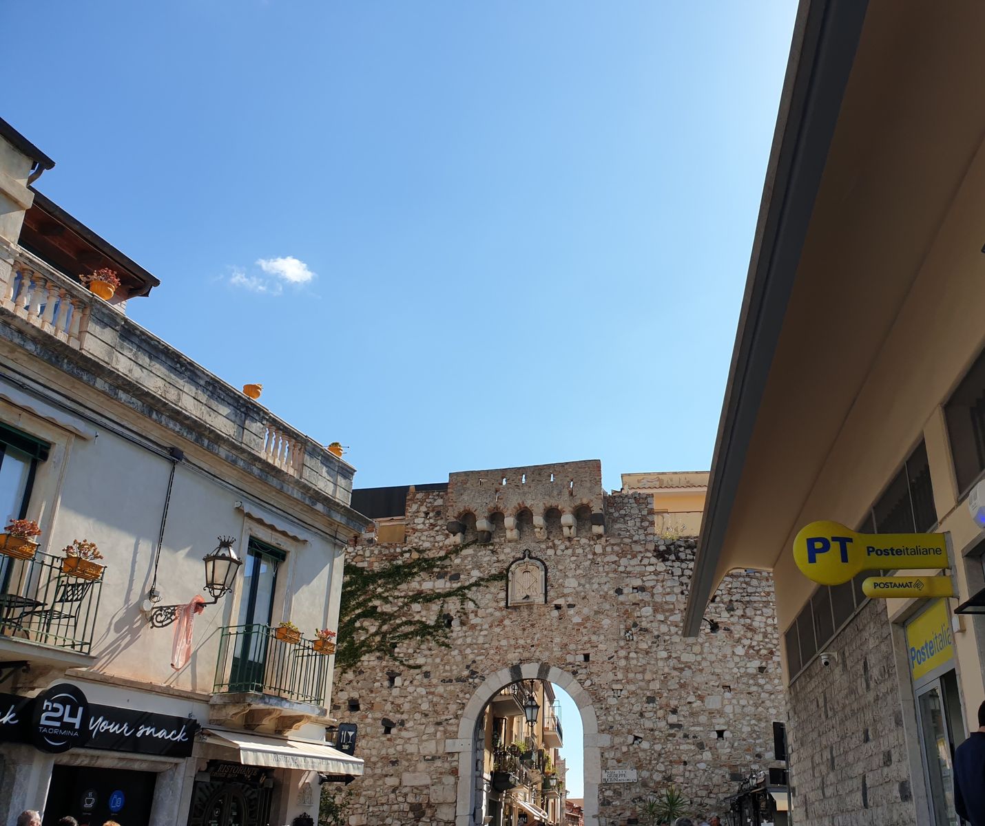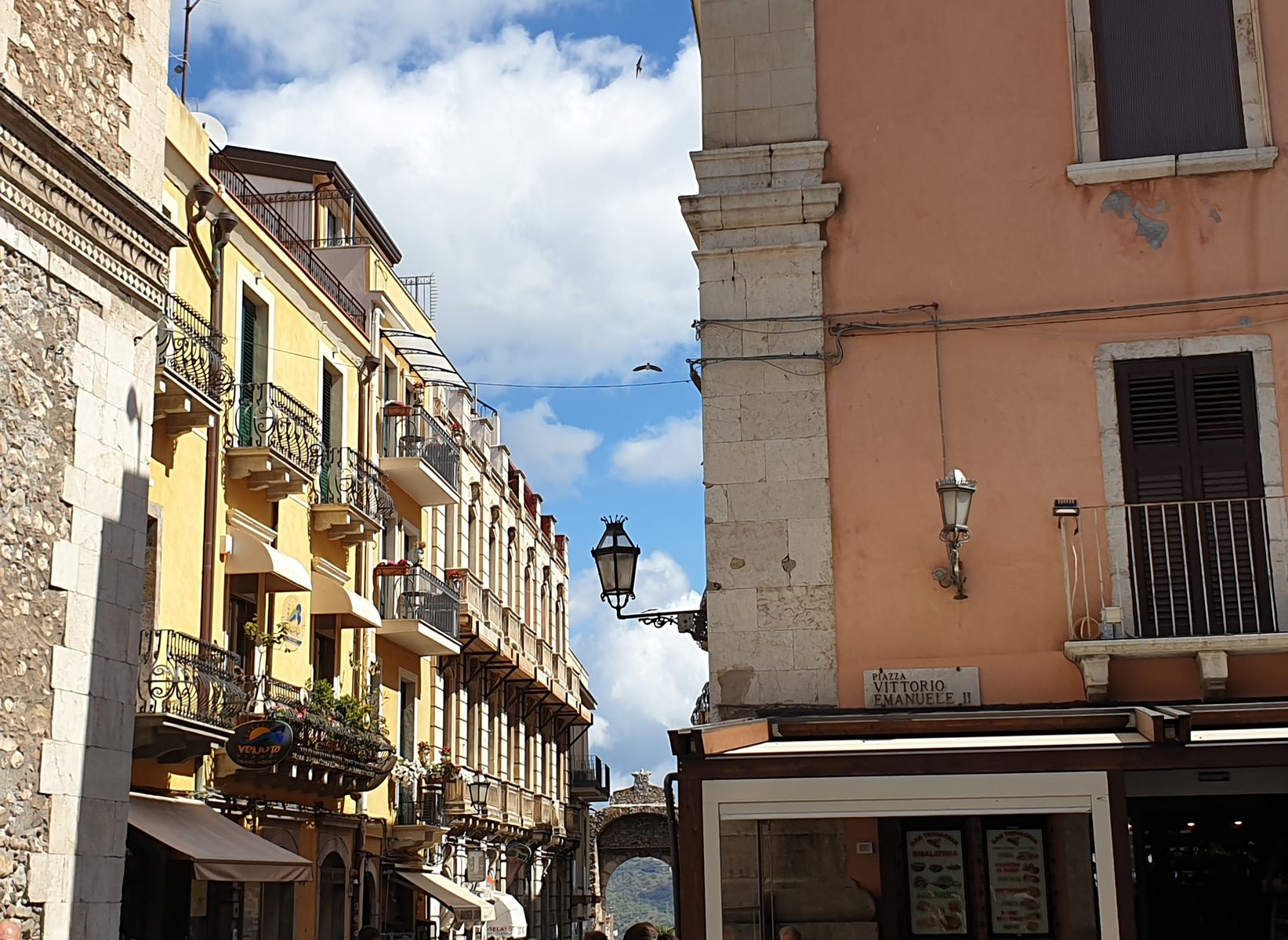 Die Fußgängerzone, Corso Umberto, ist gleichzeitig die zentrale Hauptstraße und sie endet im Norden, am Stadttor Porta Messina. Ach, Messina, der Name war gestern schon gefallen. Es gibt eine Straße von Messina – aber nicht an Land. Es ist die Wasserstraße zwischen der Fußspitze des italienischen Stiefels und der Insel Sizilien. „Ach, hier könnte ich es gut aushalten“, sage ich zu meiner Tochter. Sie nickt, ist mit schauen beschäftigt. Die Häuser spiegeln südliches Flair wieder, Blumentöpfe, hübsche Balkone, schmale Gassen, Läden, Boutiquen – man weiß eigentlich gar nicht, wohin man zu erst schauen soll.