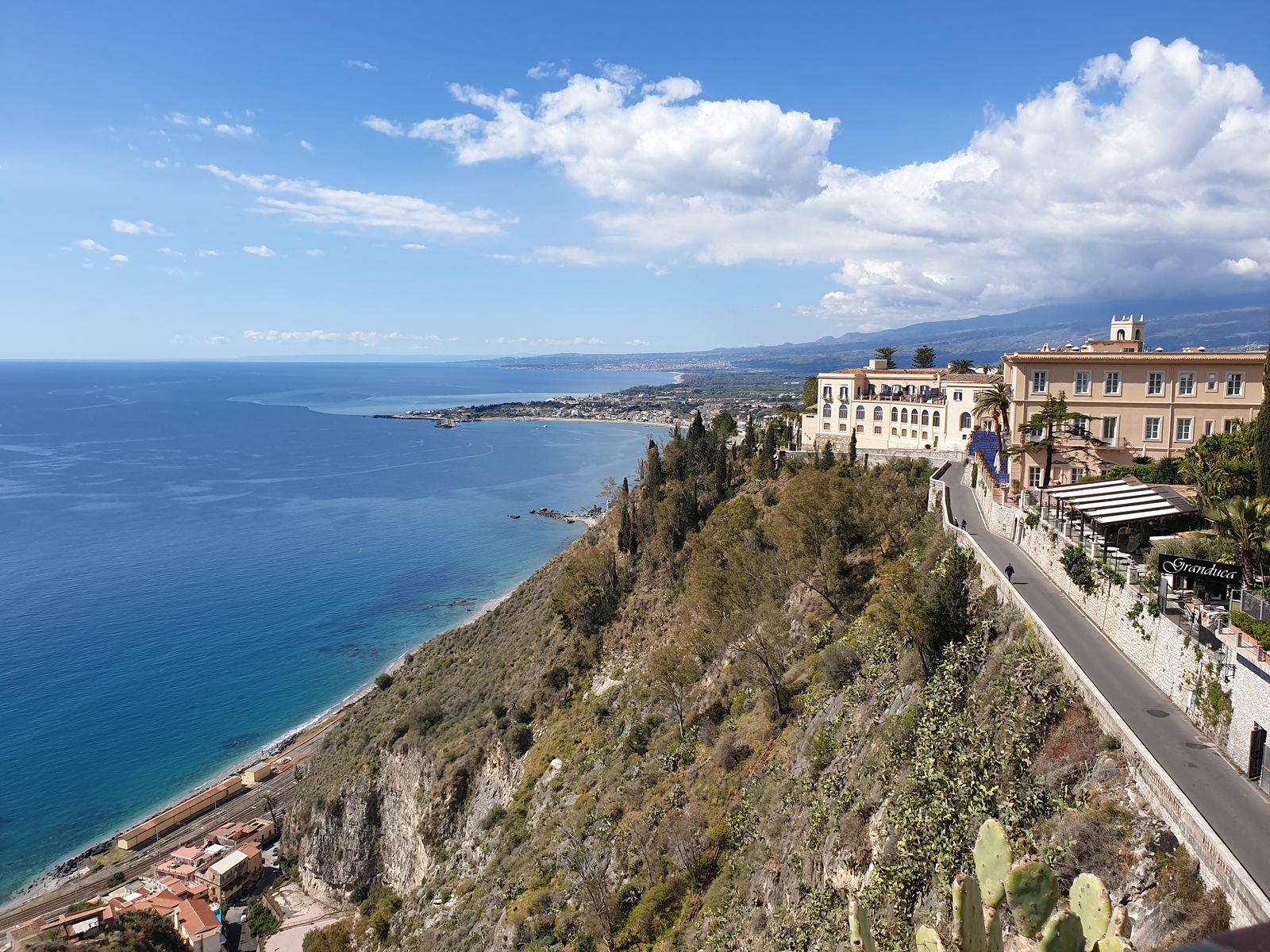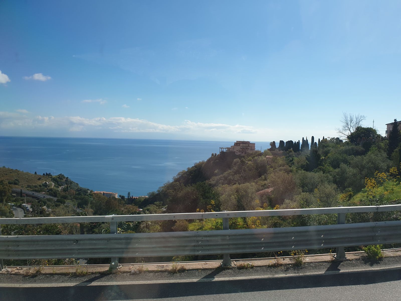 Eine gut ausgebaute mautpflichtige Autobahn geht in Richtung Taormina, unser heutiges Ausflugsziel. Auf der einen Seite liegt das Meer und auf der anderen Seite entdecken wir die zerklüftete Landschaft mit Häusern an den Hängen.