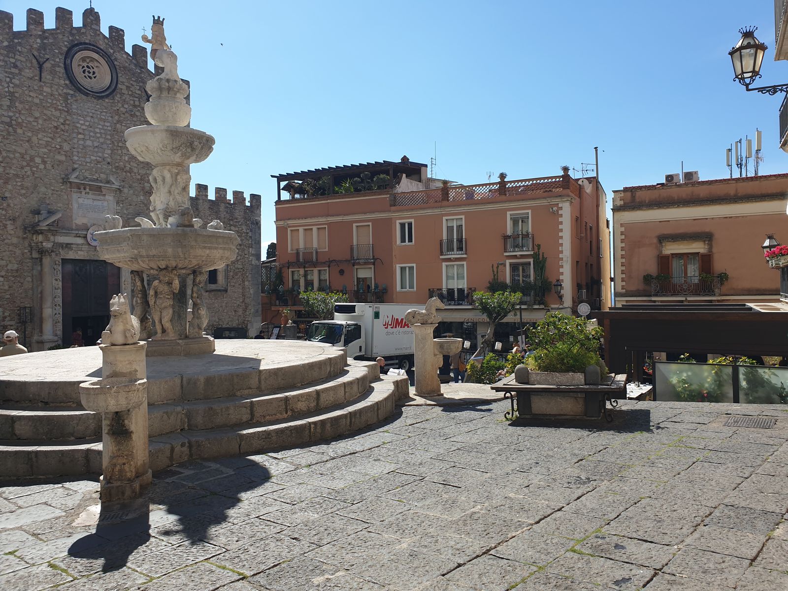 Und wie in fast jeder Stadt, gibt es zentral eine Kirche beziehungsweise einen Dom. Dieser hier ist San Nicolo di Bari gewidmet und wurde im 13. Jahrhundert erbaut und ähnelt wie viele Kirchen aus der Zeit einer Festung. Sie trägt den Spitznamen Festungskathedrale oder Cattedrale Fortezza. Für einen Teil der Säulen wurde Taormina-Marmor verwendet. Vor der Kirche befindet sich der Minotaurusbrunnen, der auch das Symbol der Stadt ist und die Flagge ziert. Insgesamt ein schöner Platz, der zum verweilen einlädt.