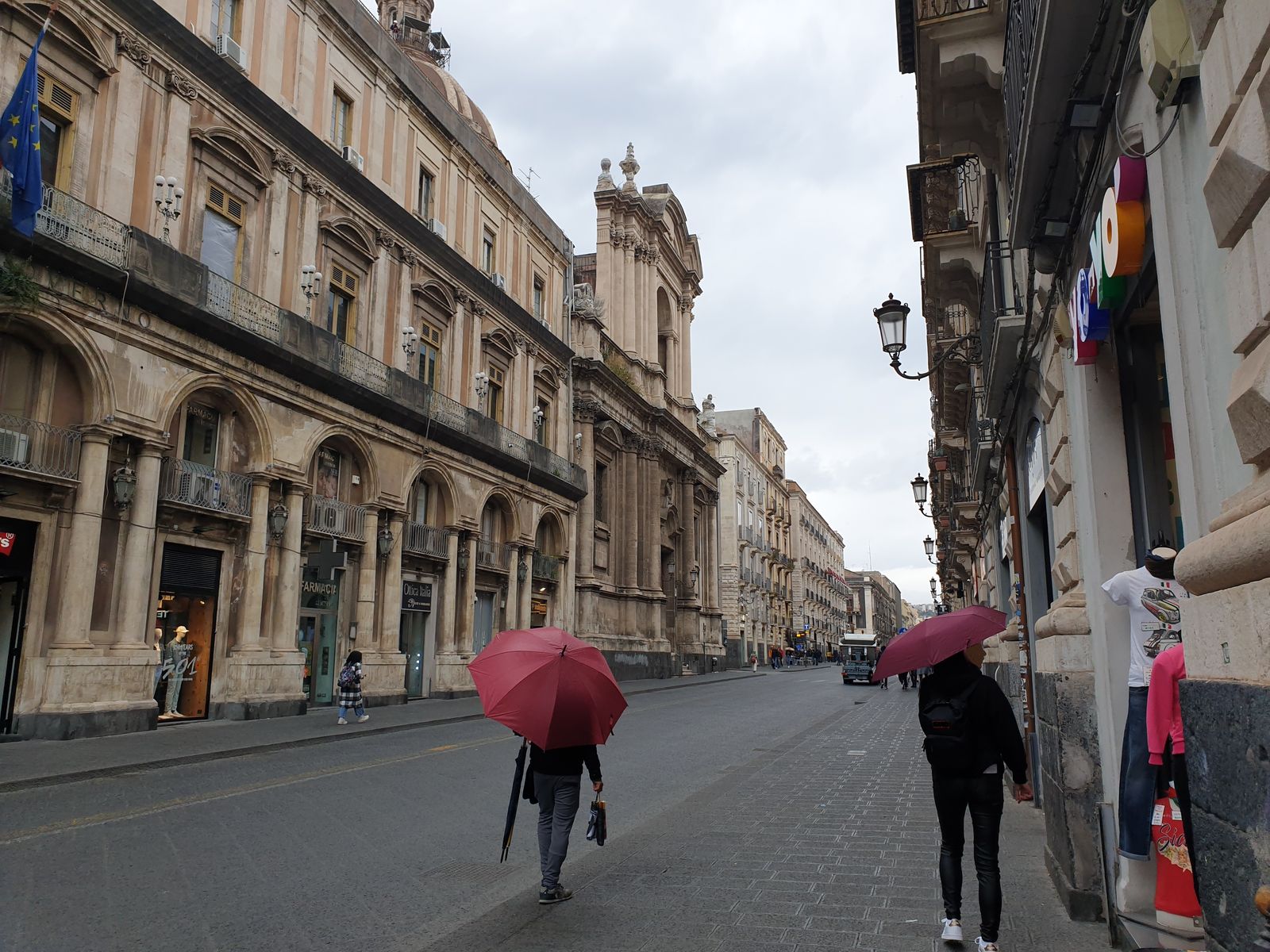 Vorbei an riesigen antiken Gebäuden, wie dem Dom, schlendern wir umher und weil ich meine, ich finde hier auf Sizilien Schuhe für meine kleinen Füße, betreten wir ein schickes Kaufhaus. Schuhe gibt es, aber nicht für mich – Tochter strahlt! Und dann entdecke ich auf einem Ständer einen hübschen leichten Regenmantel im Leopardenlook. Ja, den muss ich haben und zack, Karte gescannt und der Mantel gehört mir. Als wir auf die Straße treten, brechen wir in Gelächter aus: warum? Es regnet und so kann ich den neuen Mantel gleich mal testen. Er trägt sich super, ist bequem, leicht und die Kapuze nett geschnitten.