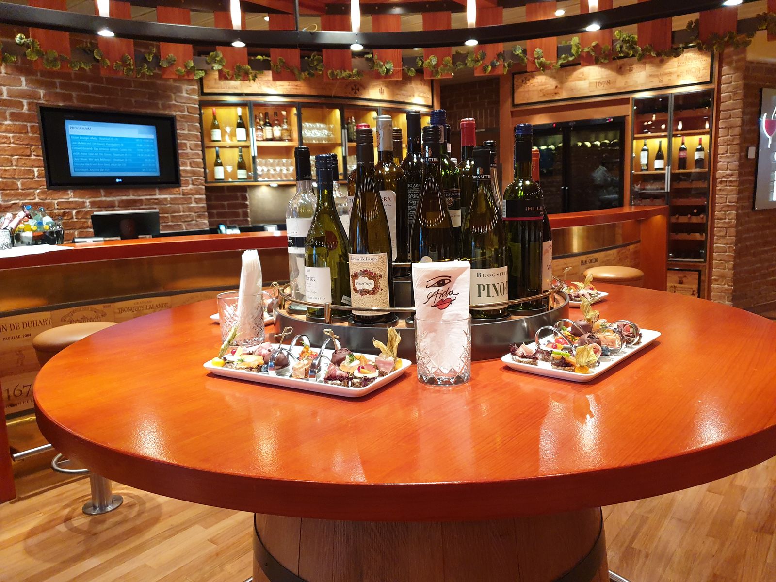 Auf dem Schiff herrscht gähnende Leere, die meisten der Passagiere sind noch „on Tour“ oder haben sich nach drinnen verkrochen. Der Regen hält nicht lange an und so kann man das Sail away bestimmt trocken erleben. In der Vinothek ist alles vorbereitet für den Suitentreff.