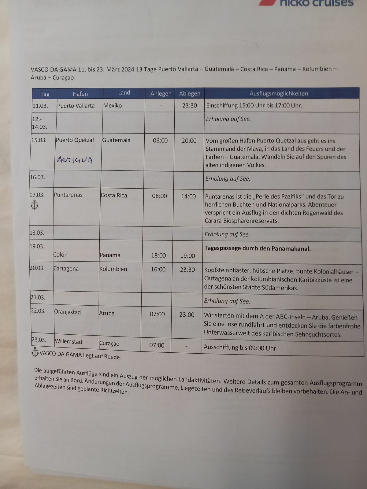 Wir bekommen den neuen Fahrplan, offensichtlich geht Nicko nicht davon aus, dass das Problem schnell repariert werden kann. Es fallen wieder 2 Anlegehäfen aus. Mittlerweile habe wir aber auch keine Ausflüge mehr privat gebucht so daß es für uns kein Problem mehr darstellt. Momentan sich noch Cartagena, Aruba und Curcao im Programm, alles andere ist für uns nicht soo wichtig aber andere Passagiere haben sicher andere Prioritäten.