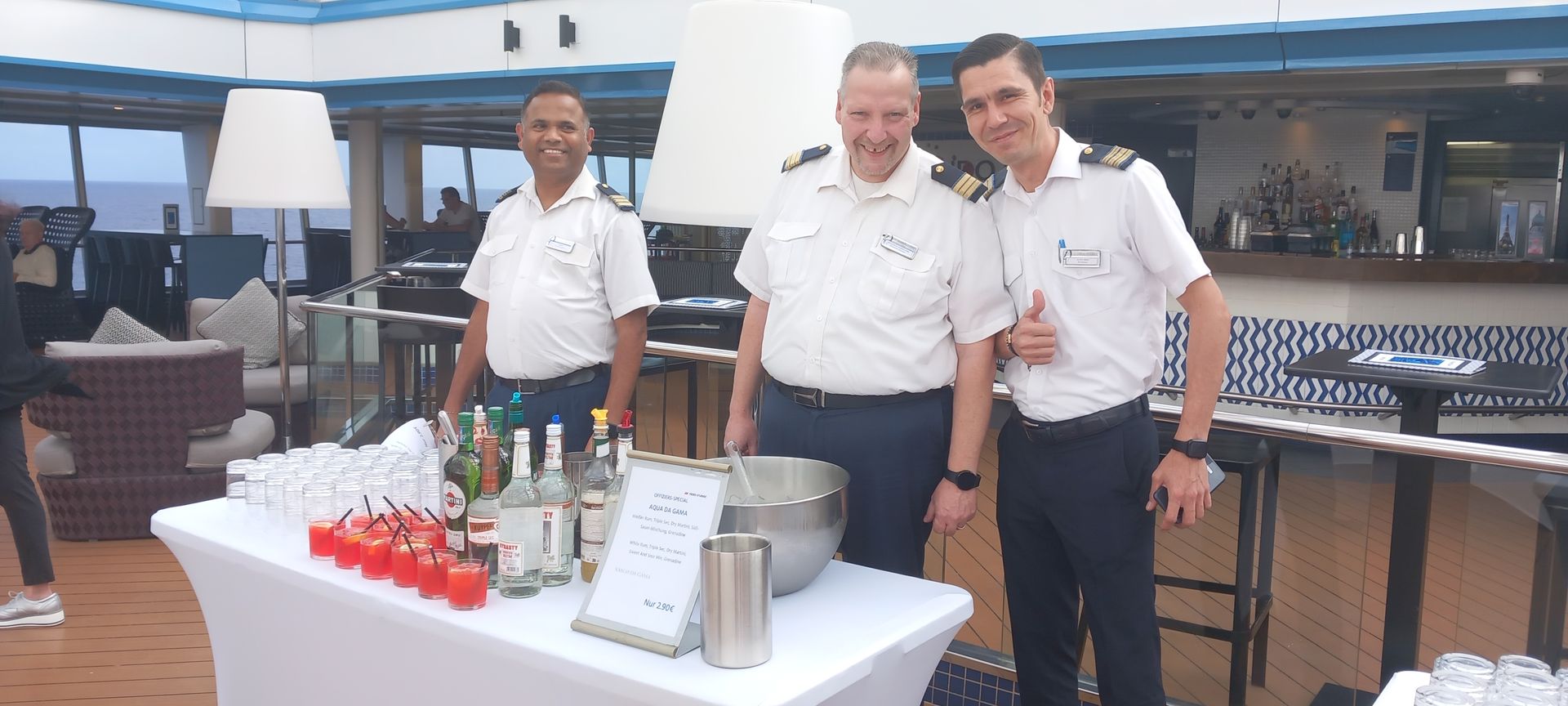 Offiziere sind immer wieder auch im Gästebereich zu sehen und auch ansprechbar. Auch der Kapitän geht von Zeit zu Zeit durch das Schiff, auch er gibt gerne Auskunft wenn man eine Frage hat.