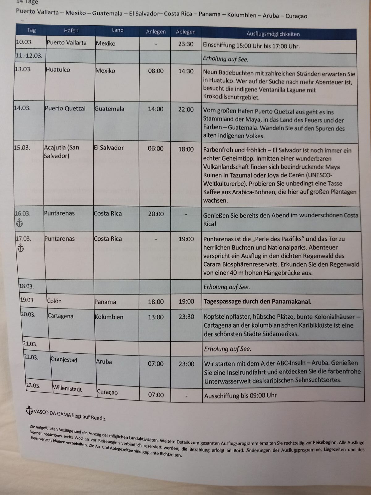 Wir bekommen den neuen Fahrplan, offensichtlich geht Nicko nicht davon aus, dass das Problem schnell repariert werden kann. Es fallen wieder 2 Anlegehäfen aus. Mittlerweile habe wir aber auch keine Ausflüge mehr privat gebucht so daß es für uns kein Problem mehr darstellt. Momentan sich noch Cartagena, Aruba und Curcao im Programm, alles andere ist für uns nicht soo wichtig aber andere Passagiere haben sicher andere Prioritäten.