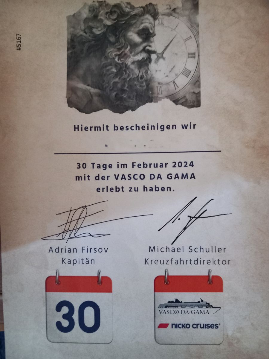 Man bekommt immer wieder Urkunden für z.b. die Äquator Überquerung, ist jetzt nicht so etwas besonderes, aber einen Februar mit 30 Tagen erlebt man wahrscheinlich nur 1x im Leben.