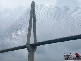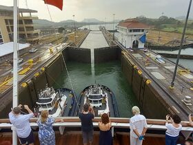 Der Kapitän gibt Gas und wir überholen sogar ein Frachtschiff. Gegen 14 Uhr sind wir bei den Schleusen am Ausgang des Kanals wo das Schiff wieder auf Meeresspiegel abgesenkt wird.