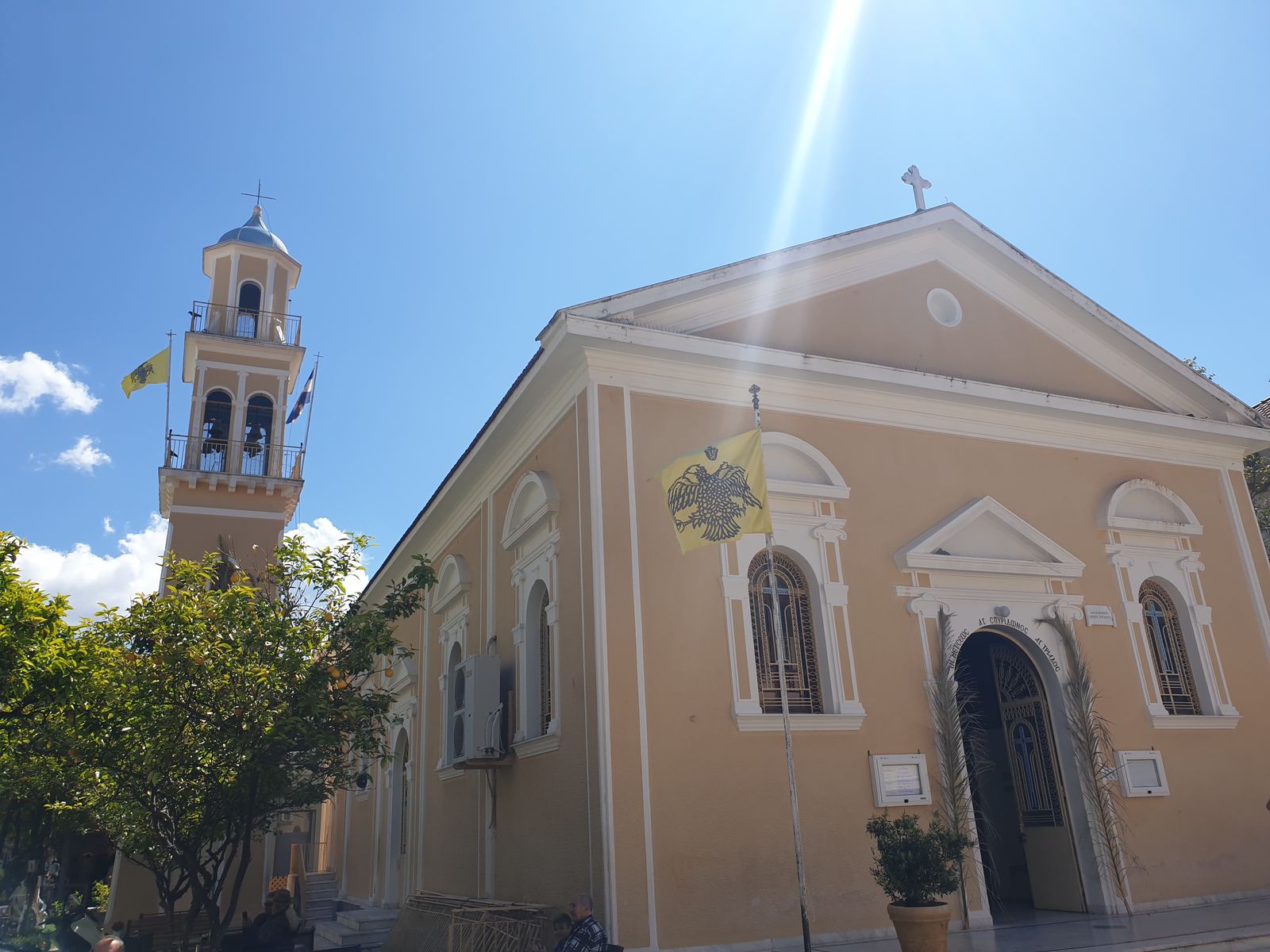 Die Fahnen auf dem Glockenturm der Ekklisia Evaggelistria wehen im Wind und der Innenraum ist sehenswert.