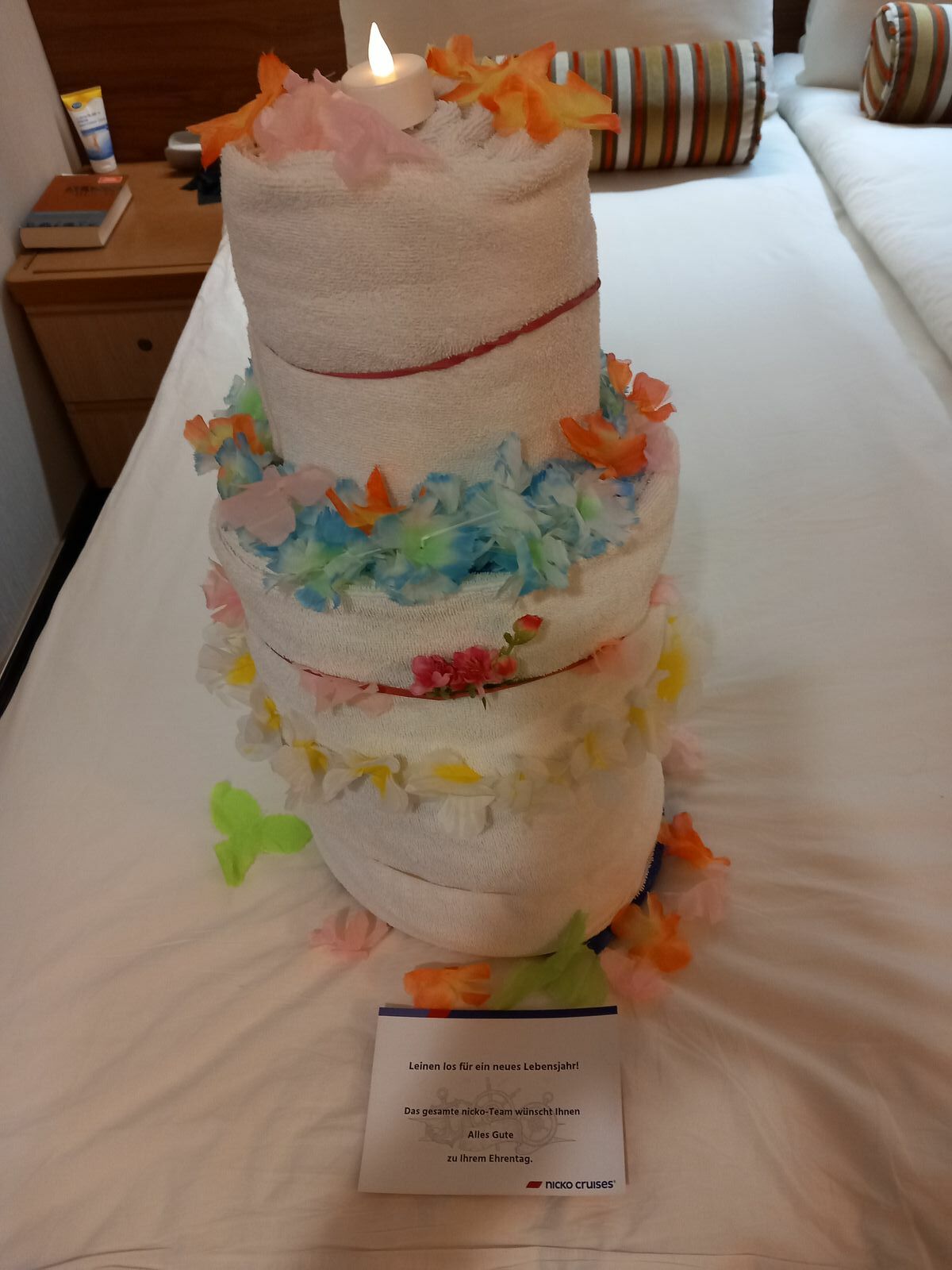 Meine Frau hat heute Geburtstag und der Zimmerservice überrascht uns heute mit einem Handtuch Kuchen.