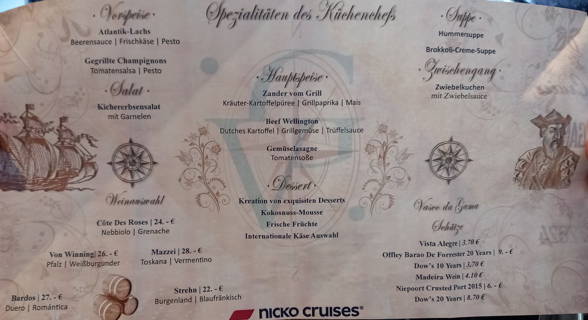 Der Proviant geht langsam aus. Das alkoholfreie Erdinger Weizenbier gibt es nicht mehr. Der im Getränkepaket enthaltene portugiesische Weißwein ist aus, statt dessen gibt es einen (für uns) besseren chilenischen Weißwein. Den ebenfalls ausgezeichneten portugiesische Rose gibt es auch nicht mehr. Statt dessen einen anderen der uns aber nicht mehr so gut schmeckt.