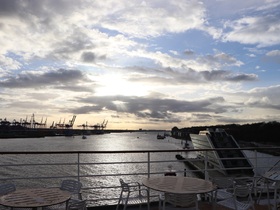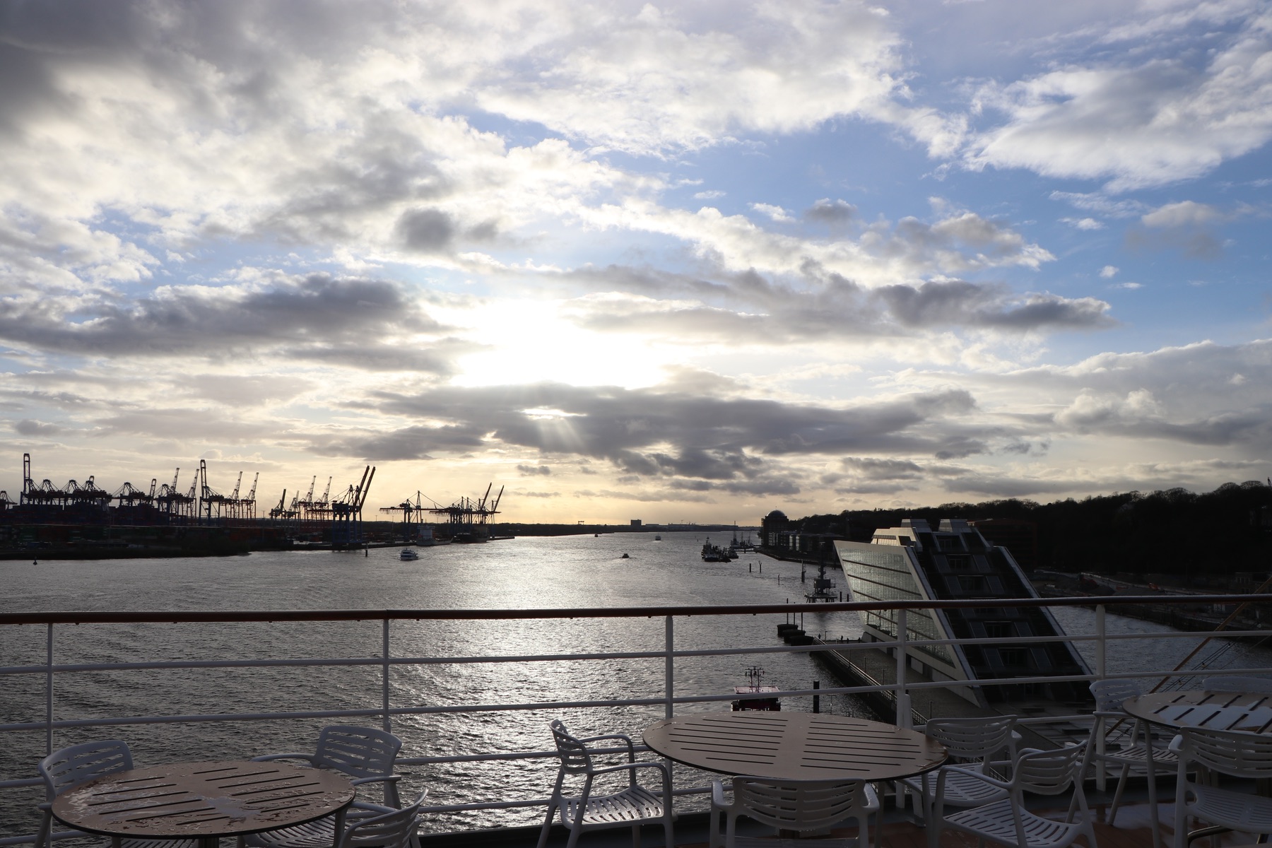 Um 9:00h verließen wir das Hotel und machten uns mit dem Auto direkt auf dem Weg nach Altona. Der Weg dahin war sehr schön leer, so dass wir bereits um 9:30h da waren. Wir gingen noch zu unserem leckeren Bäckerei Cafe Schmidt und nahmen eine Kleinigkeit an Frühstück. Gegen 10:00h konnten wir unseren Gepäck abgeben und unser Auto haben wir dann an Parken & Meer abgegeben. Gegen 10:30 standen wir draußen fast vorne für Check In. Durch Gespräche mit Ingo und Paula verging die Zeit sehr schnell. Gegen 11:25h wurden wir weiter in das Gebäude reingeschickt, weil die Schlange immer länger und es durch den Wind zunehmend kälter wurde. Punkt 12:00h wurde das Check In geöffnet. Wir waren dann im Nu auf dem Schiff. Unsere ersten beiden Gepäckstücke waren bereits an der Kabinentür. Wir packten aus und da kam schon unser 3. Gepäckstück. Nach einer digitalen SNRÜ und Vorstellen an der Musterstation (ab 14:30h), waren wir an der Ocean Bar.