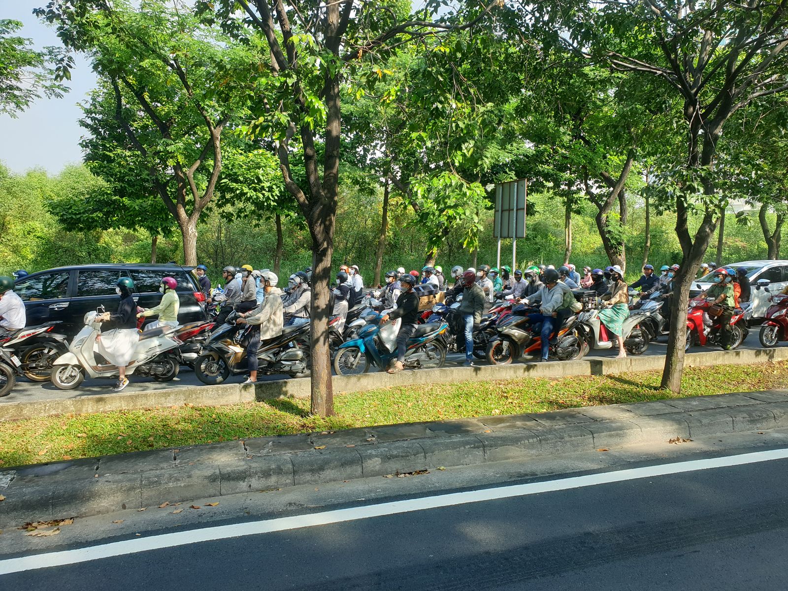 Der Hafen, in dem die Bella festgemacht hat, liegt ein Stück von der City entfernt und so hat man während der Fahrt Gelegenheit so einiges zu entdecken. Unterwegs sehen wir Reisfelder, Palmen, Mangroven, kleine Häuser, überqueren Flussläufe, vermummte Männer und Frauen auf Motorrollern (damit sie ja nicht braun werden),