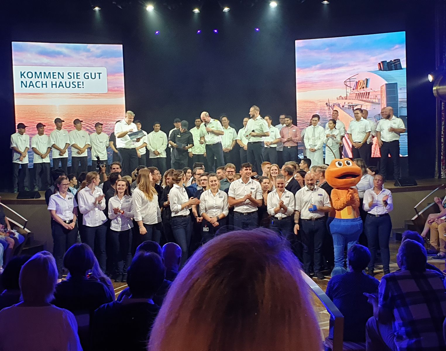 Auf der Bühne wird es eng, Crewmitglieder stehen dort oben und zum Schluss kommt Kapitän Peter Schade und der Gewinner des „Lächelmoments“ wird ausgezeichnet. Ein gute Aktion und der Gewinner bekommt viel Applaus vom Publikum.