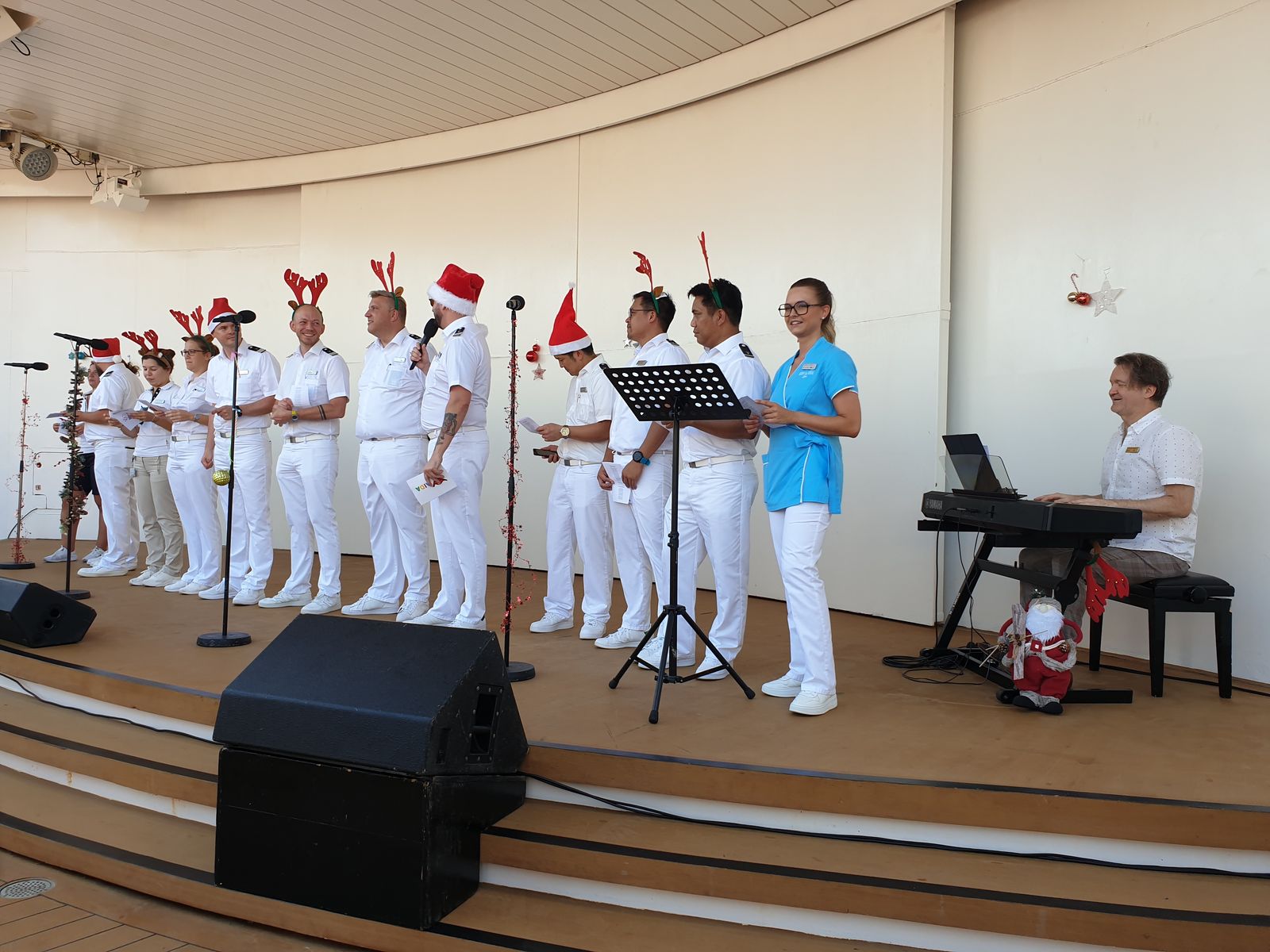 Heute wird nochmal das Pooldeck genossen und weil ja der 1. Advent ist, ist der Adventszauber an Bord. Es gibt Stollen, Waffeln, kalten Glühwein und damit so richtig Stimmung aufkommt, singen die AIDA Stars und einige Crew-Mitglieder bekannte Weihnachtslieder.